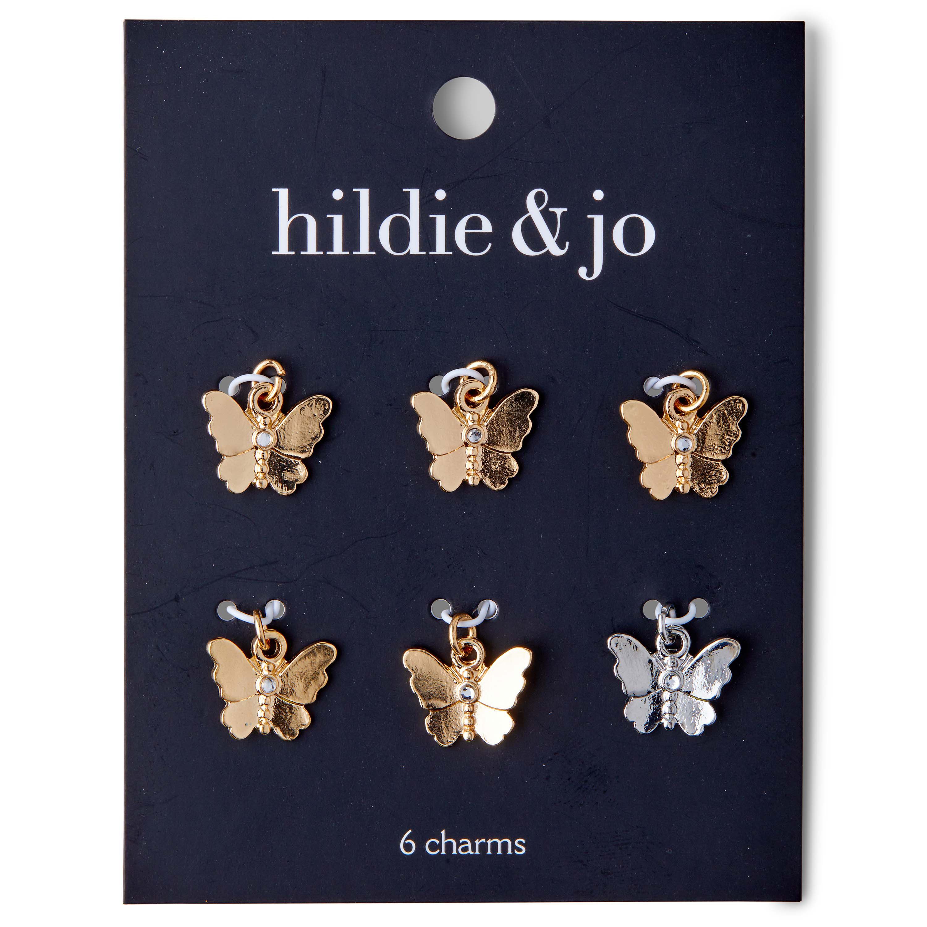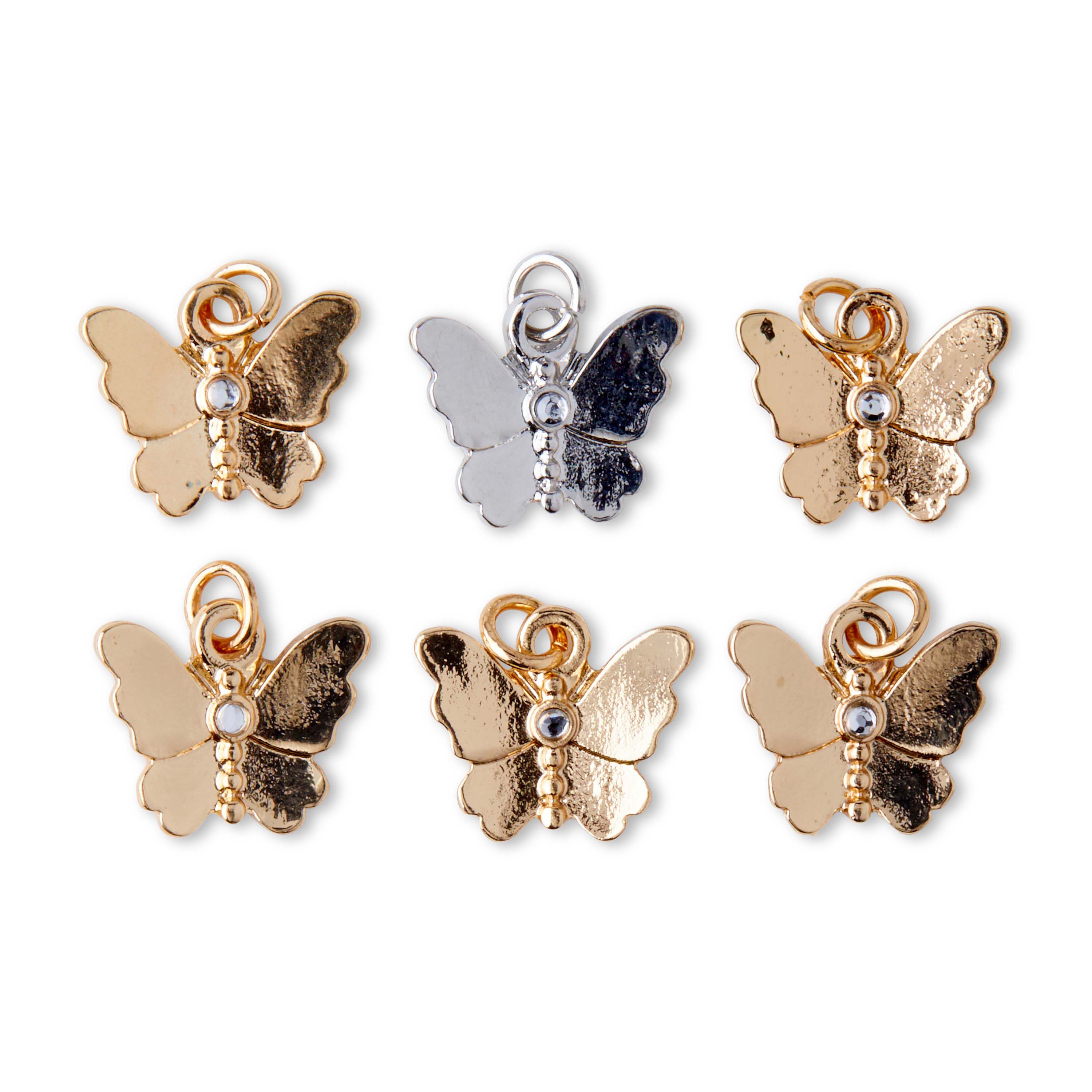 The hildie & jo Butterfly Charms - Silver & Gold will make a unique addition to your DIY jewelry-making kit. This pack includes three gold-toned and three silver-toned charms shaped like butterflies. Add them to cable or box chains sold separately, to create lovely necklaces and anklets for you and your loved ones.