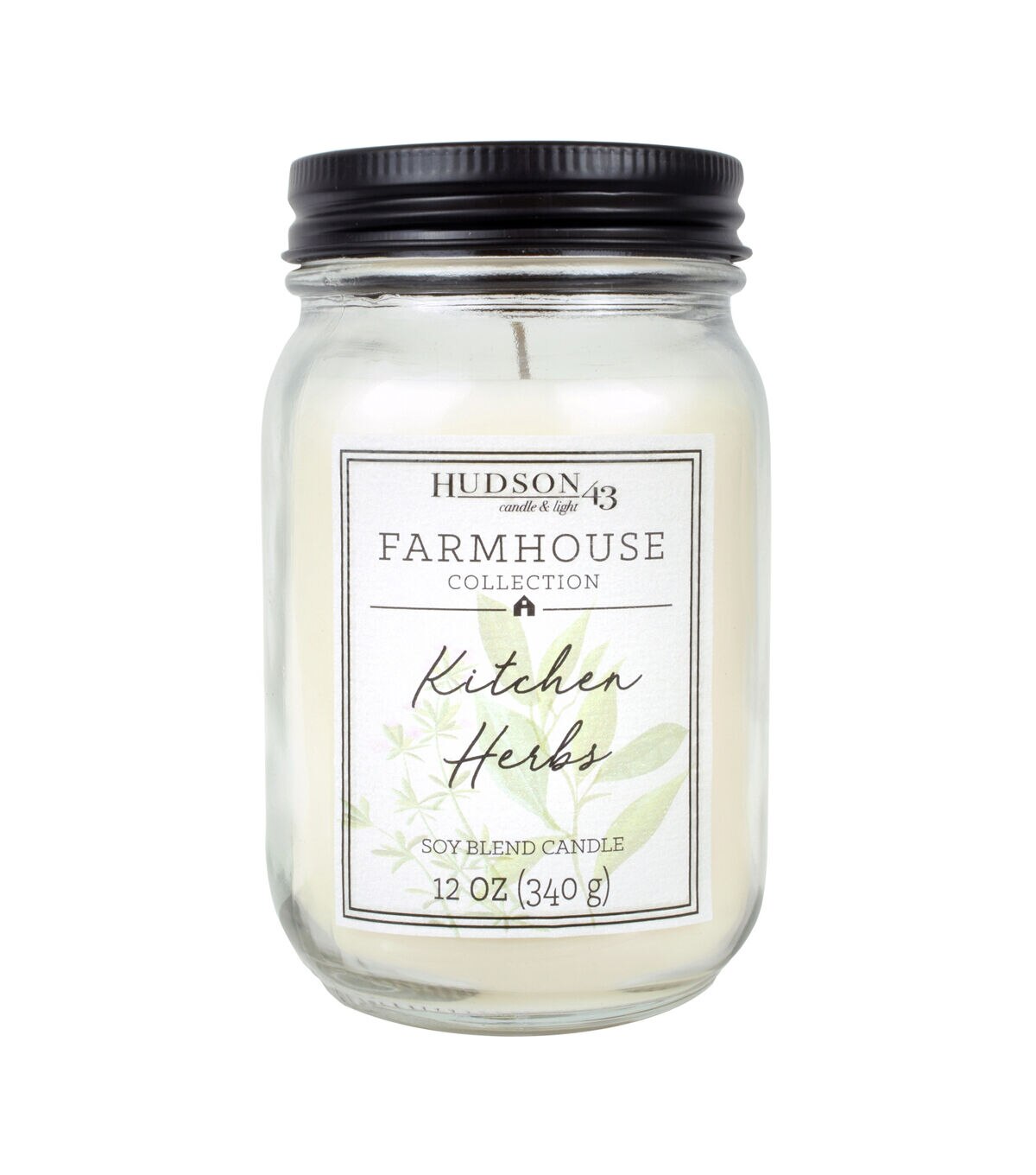 The Hudson 43 Farmhouse Collection Kitchen Herbs Mason Jar Candle offers a modern yet rustic fragrance in a beautiful package that goes with any decor. This 12-ounce clear mason jar comes with a white wax candle and a matte black lid that screws on. It includes the notes of fresh cut herbs and a hint of lemon.