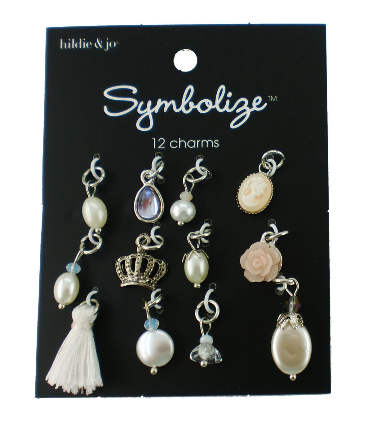 Personalize a DIY jewelry or craft project using these unique hildie & jo Symbolize Multi Silver Charms-Pearls. Great for any project, this pack includes 12 charms, all in different shapes. Some are created by pearls of varying shapes and sizes including a flower, a silver crown, a cameo and more. These charms have jump rings for easy attachment.