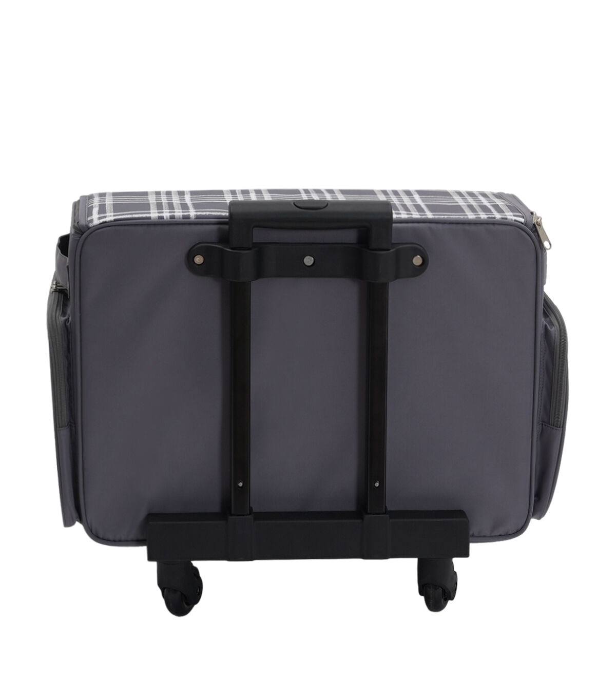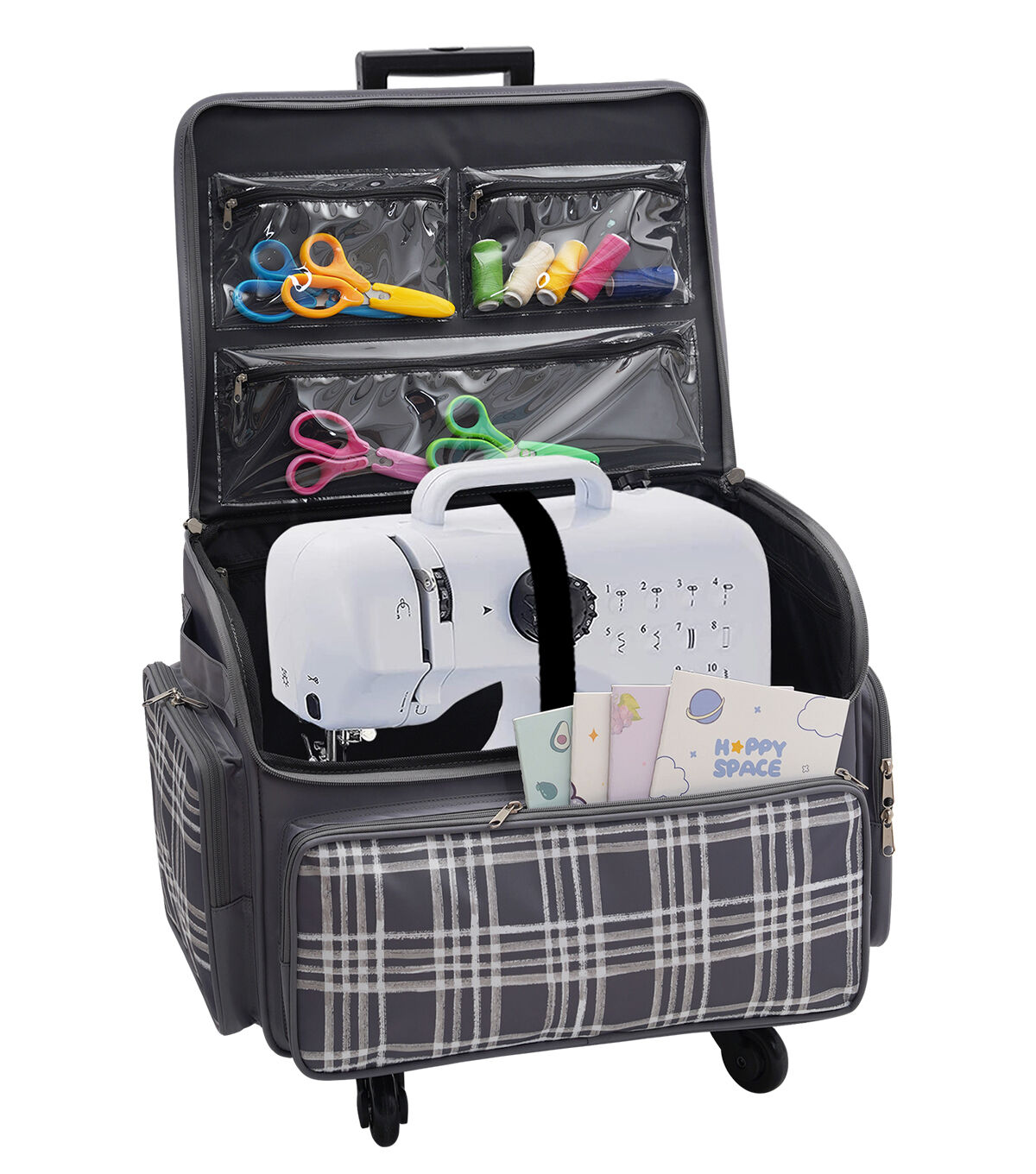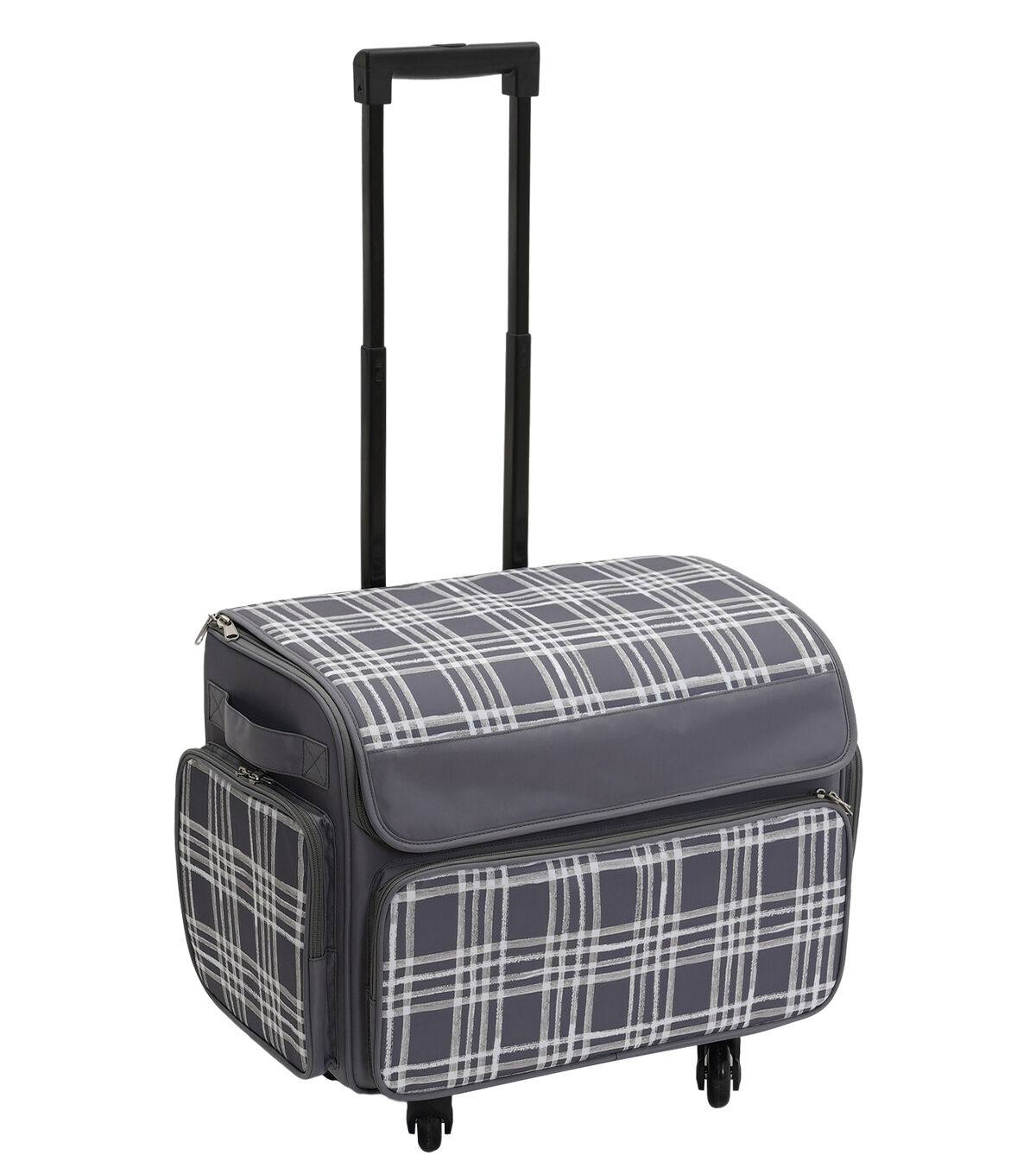 The Gray Plaid Rolling Sewing Machine Storage Tote by Top Notch is just what you need to store all your craft or sewing supplies. This rolling sewing machine storage tote sports a plaid pattern in a gray shade. It is designed with zipper pockets on the sides and front, clear pockets on the underside of the flap and side carrying handles. Use the built-in strap to secure your sewing machine. You can also gift it to the sewing enthusiast in your family.