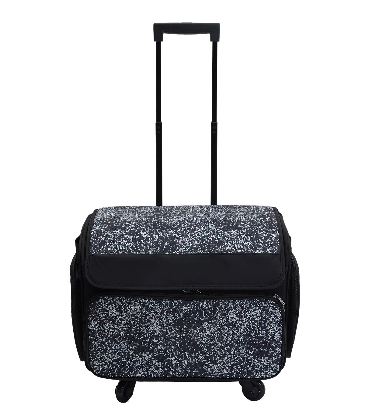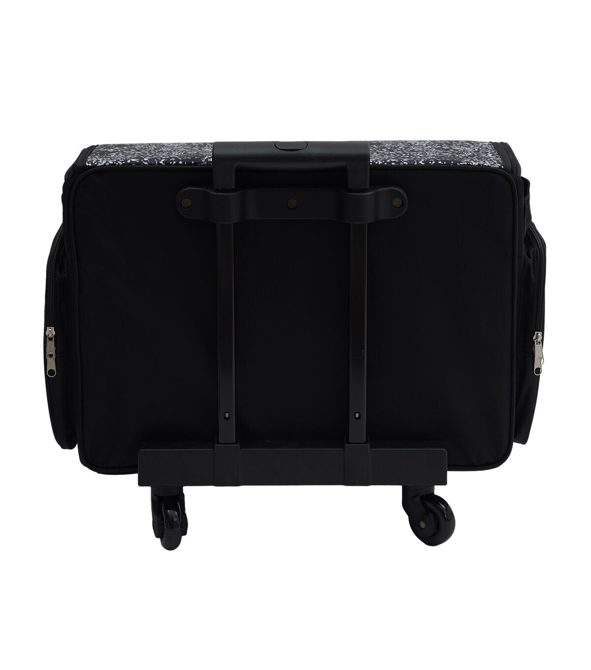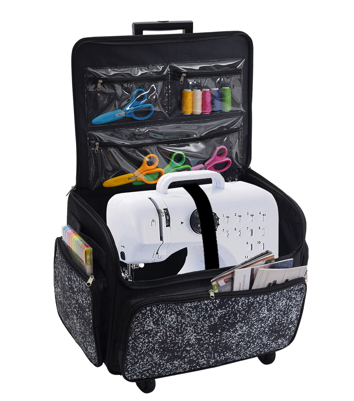 The Black Dots Rolling Sewing Machine Storage Tote by Top Notch is a stylish way to store your sewing machine and essentials safely. This storage bag sports a dotted pattern in white on a black base. It is designed with wheels and a telescoping handle at the back to make traveling with your machine and craft supplies a breeze.