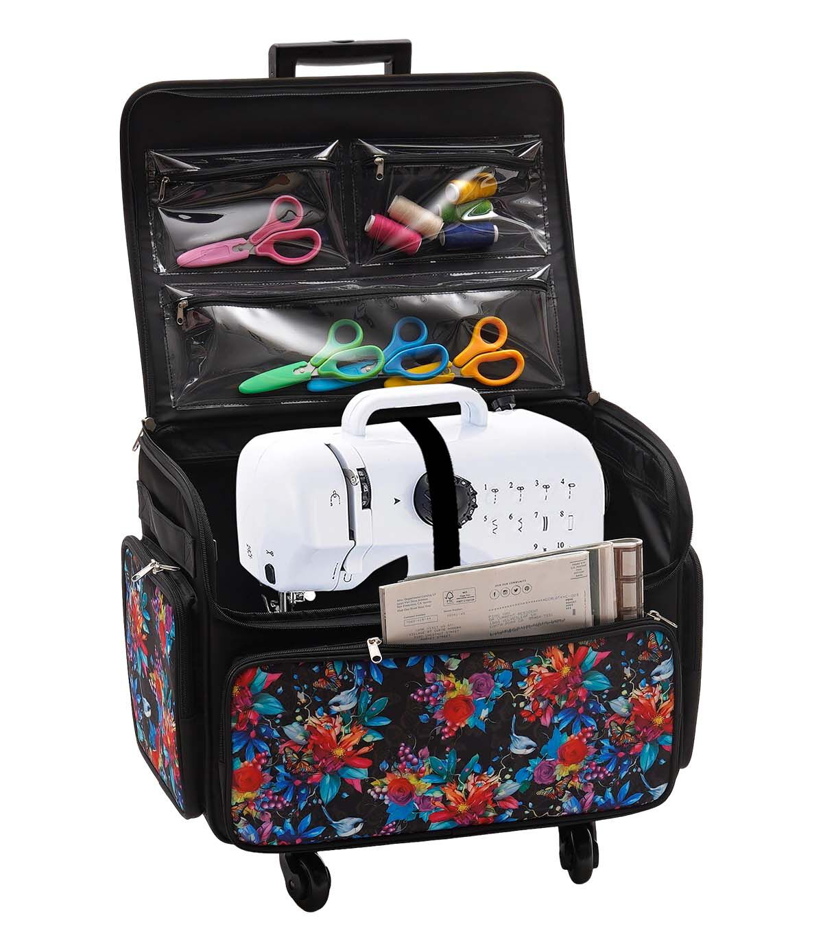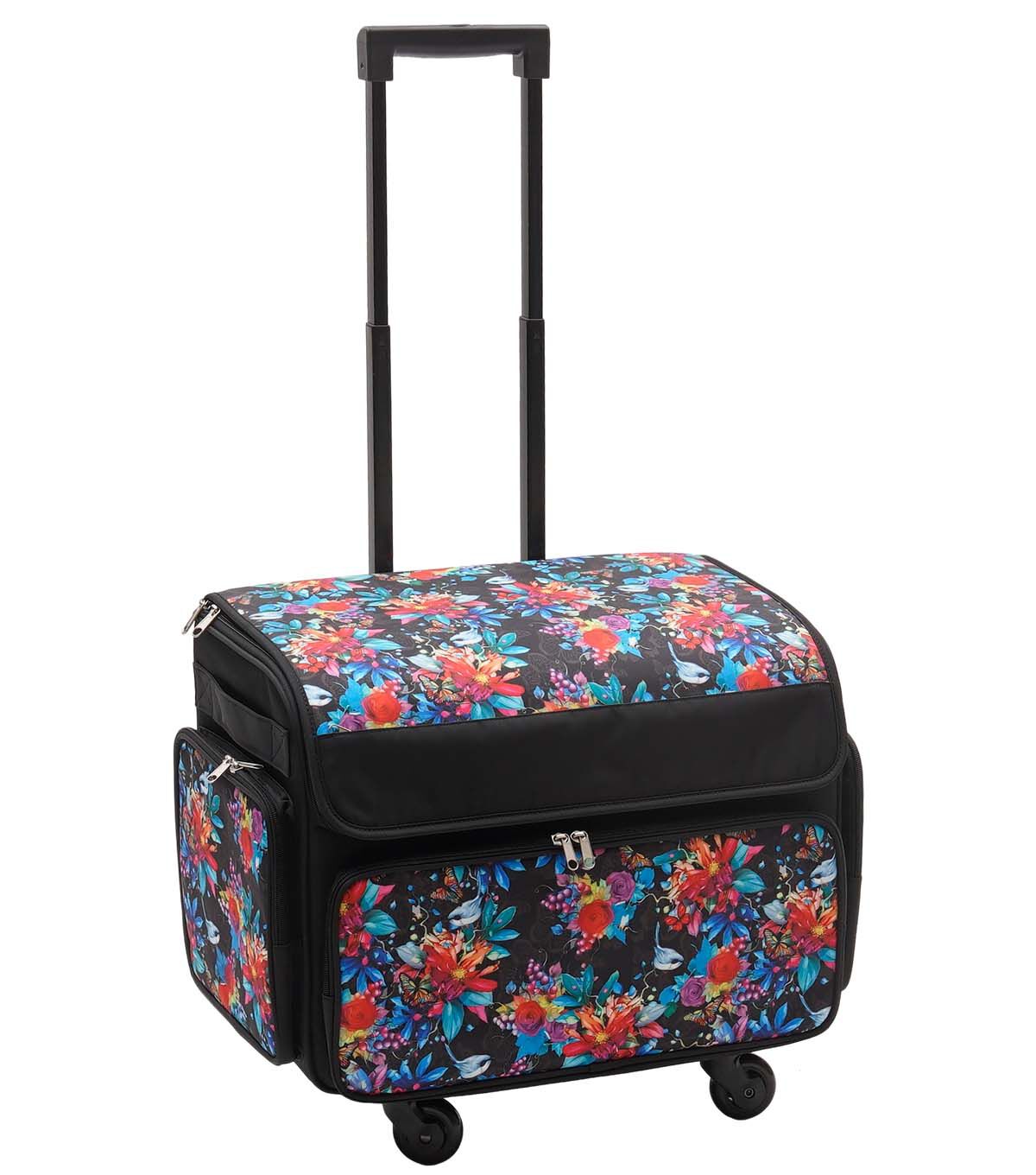 Stay Organized and Stylish with the 13" x 18" Floral & Butterfly on Black Rolling Sewing Storage Tote by Top Notch