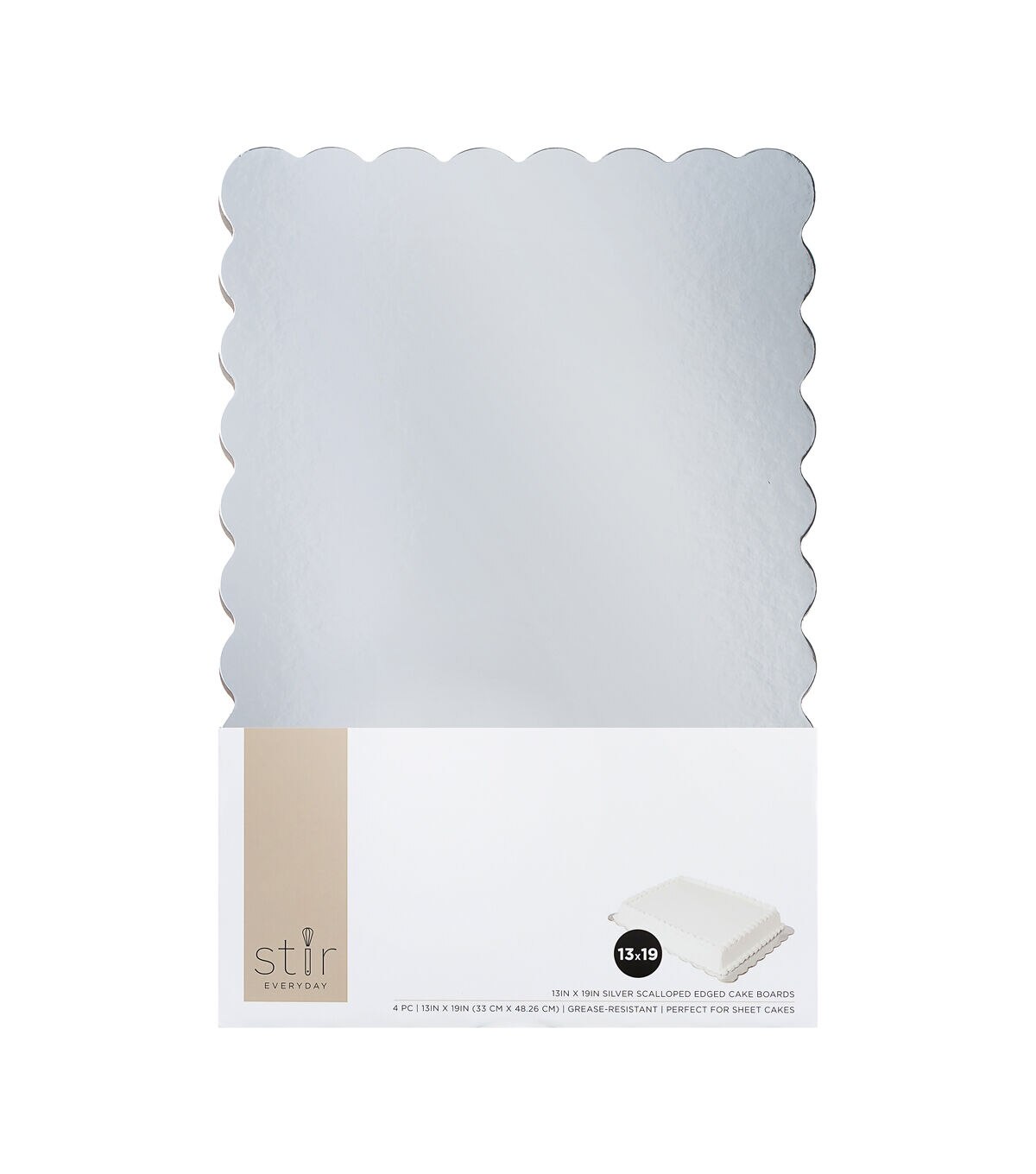 The STIR Everyday Scalloped Edge Cake Boards - Silver will give your homemade baked goods a professional look. These cake boards flaunt a silver tone and come with scalloped edges. They are greaseproof and just what you need for a sheet cake. You can use them to display cakes during weddings, birthday parties, baby showers and more.