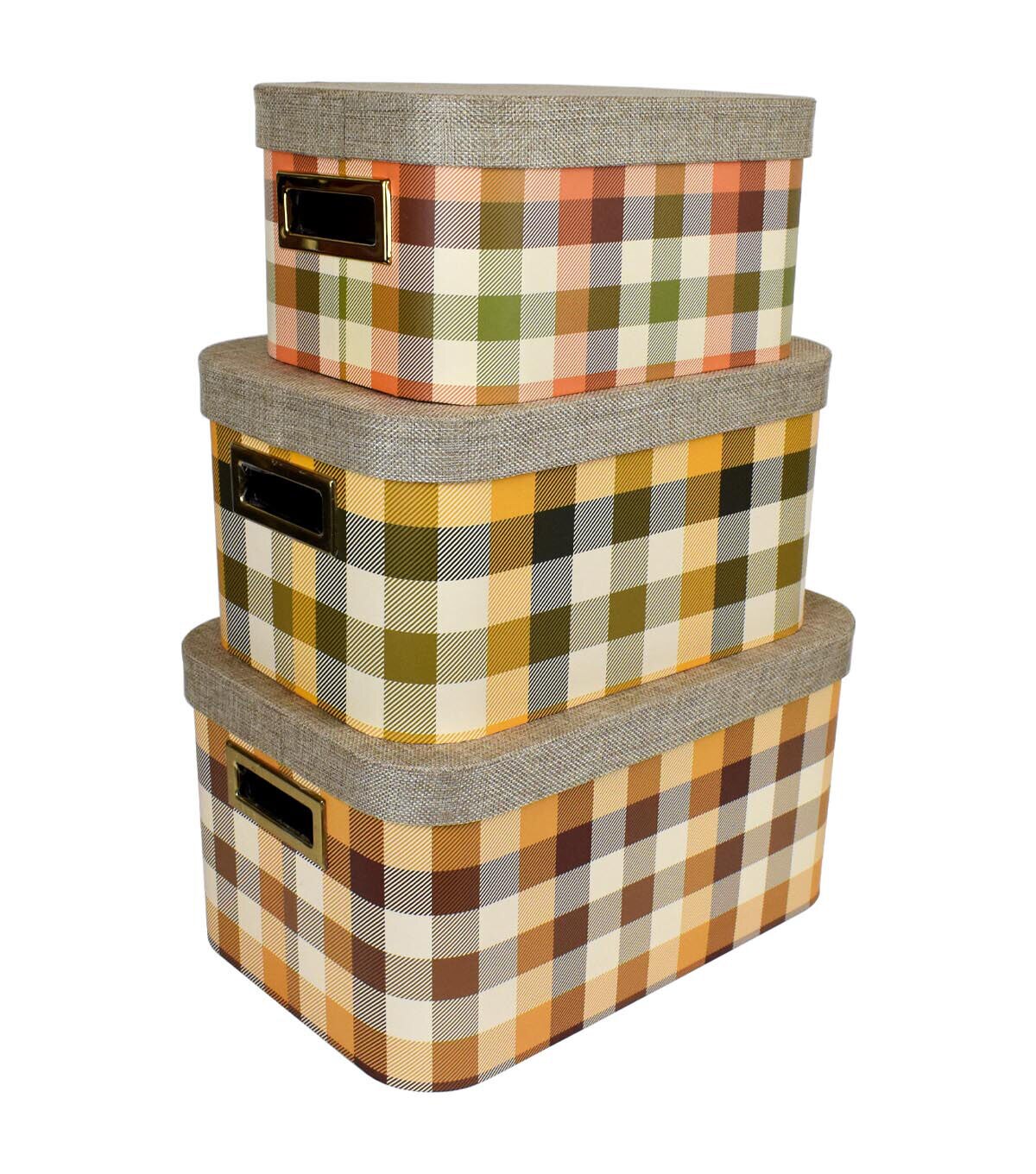 Say goodbye to clutter and use the Medium Storage Box with Oval Lid - Buffalo Checks to organize your stationery items. This storage box sports a checkered pattern in vivid shades and comes with a fabric lid. It is designed with cutout handles. You can also use it to keep your craft essentials, ornaments, recipe books and more.