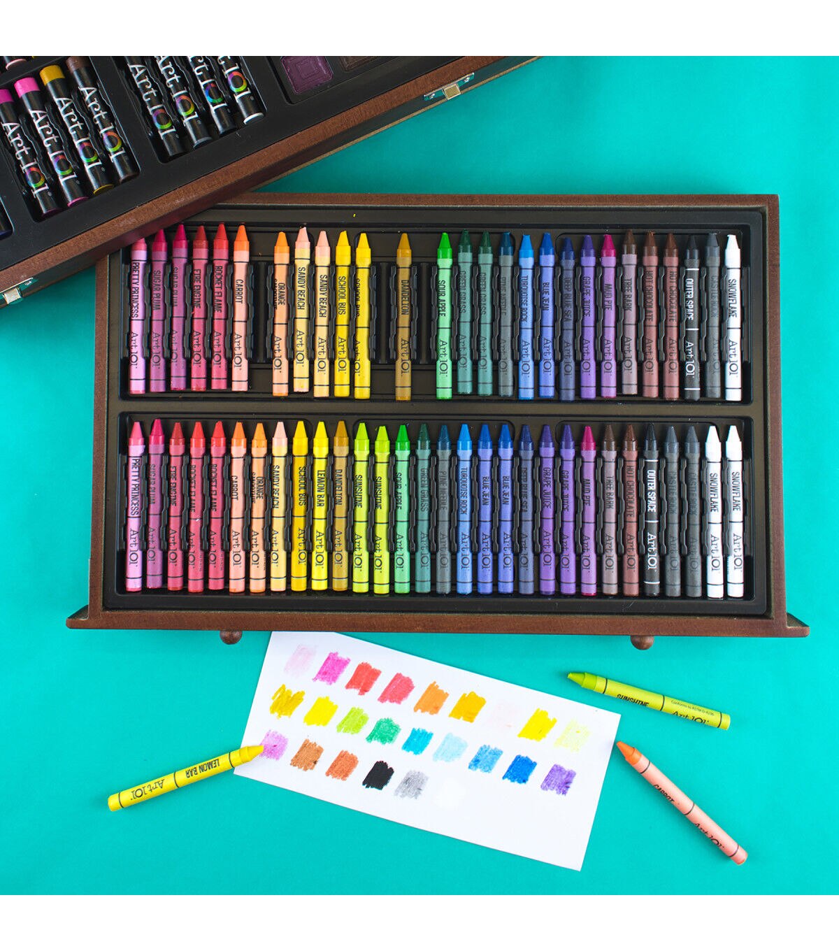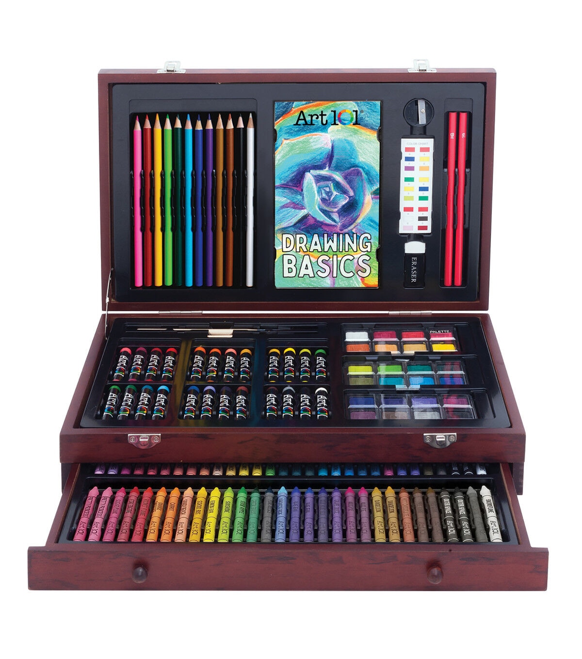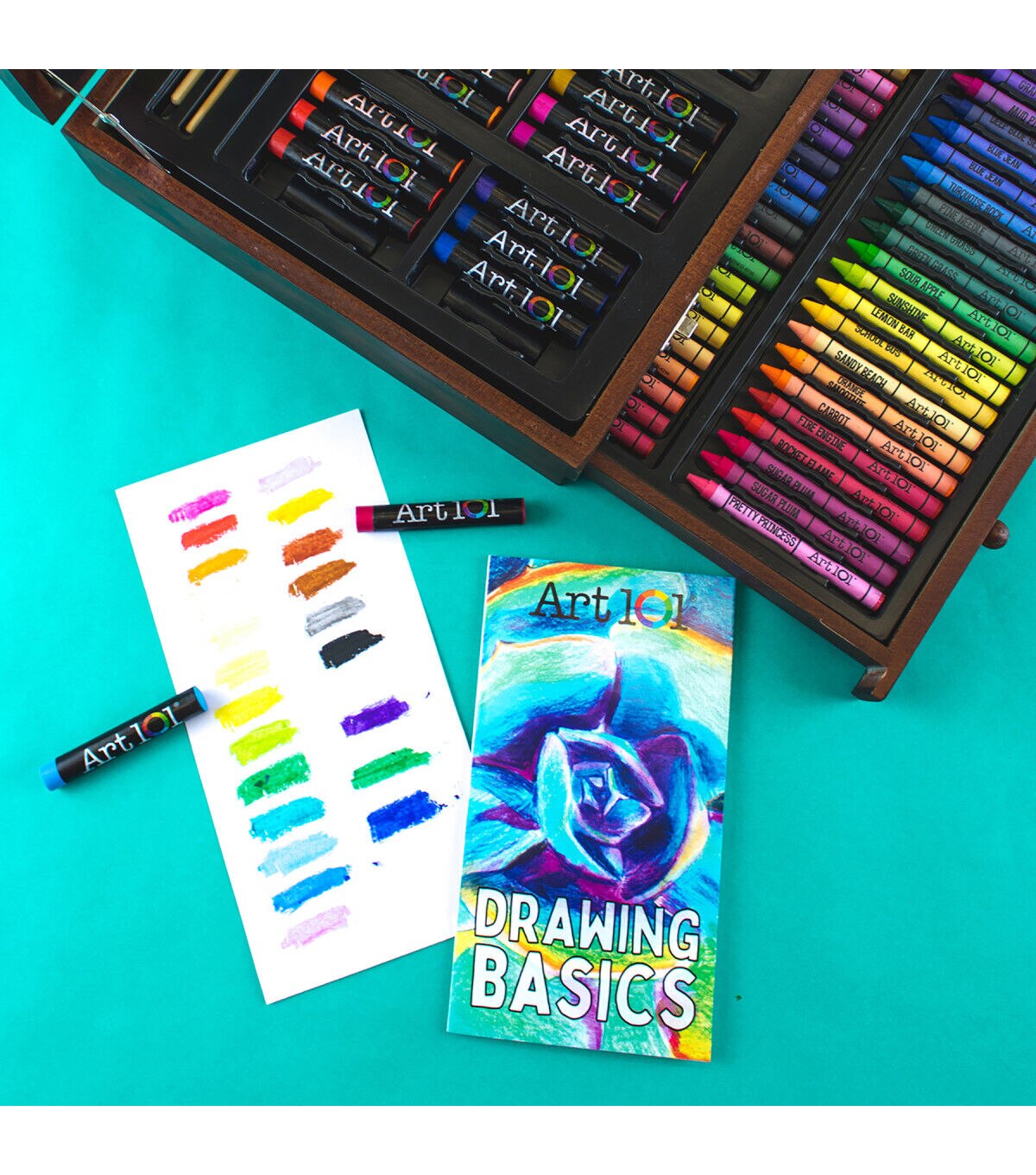 Art 101's Doodle and Draw 136 Piece Multimedia Wood Art Set includes all the tools needed to expand your creativity and design your next colorful masterpiece! Includes 12 of our colorful Premium Core Colored Pencils, which are perfect for the beginner and advanced artist alike! Our Premium Core Colored Pencils lay down smooth and pigmented on your paper. Build up the color and opacity by varying the pressure on your pencil, and blend different colors together to create different shading effects! There's something for everyone in our 136 Piece Art Set, which also comes with 24 oil pastels and 60 colorful crayons! Our oil pastels are creamy and pigmented, and blend together easily on your paper. Try using the included sketch pencils to sketch out your next drawing, then color it in with your medium of choice! Want to try your hand at painting? Use the 24 watercolor cakes and included paint brushes to add a little color. Your set also includes a handy learning guide, which covers drawing basics for new artists! Follow along with the lessons and use your included supplies to brush up on your drawing skills. All your supplies come in a high-quality convenient wood carrying case, which makes keeping your artistic tools organized and easy to use whenever inspiration strikes!
