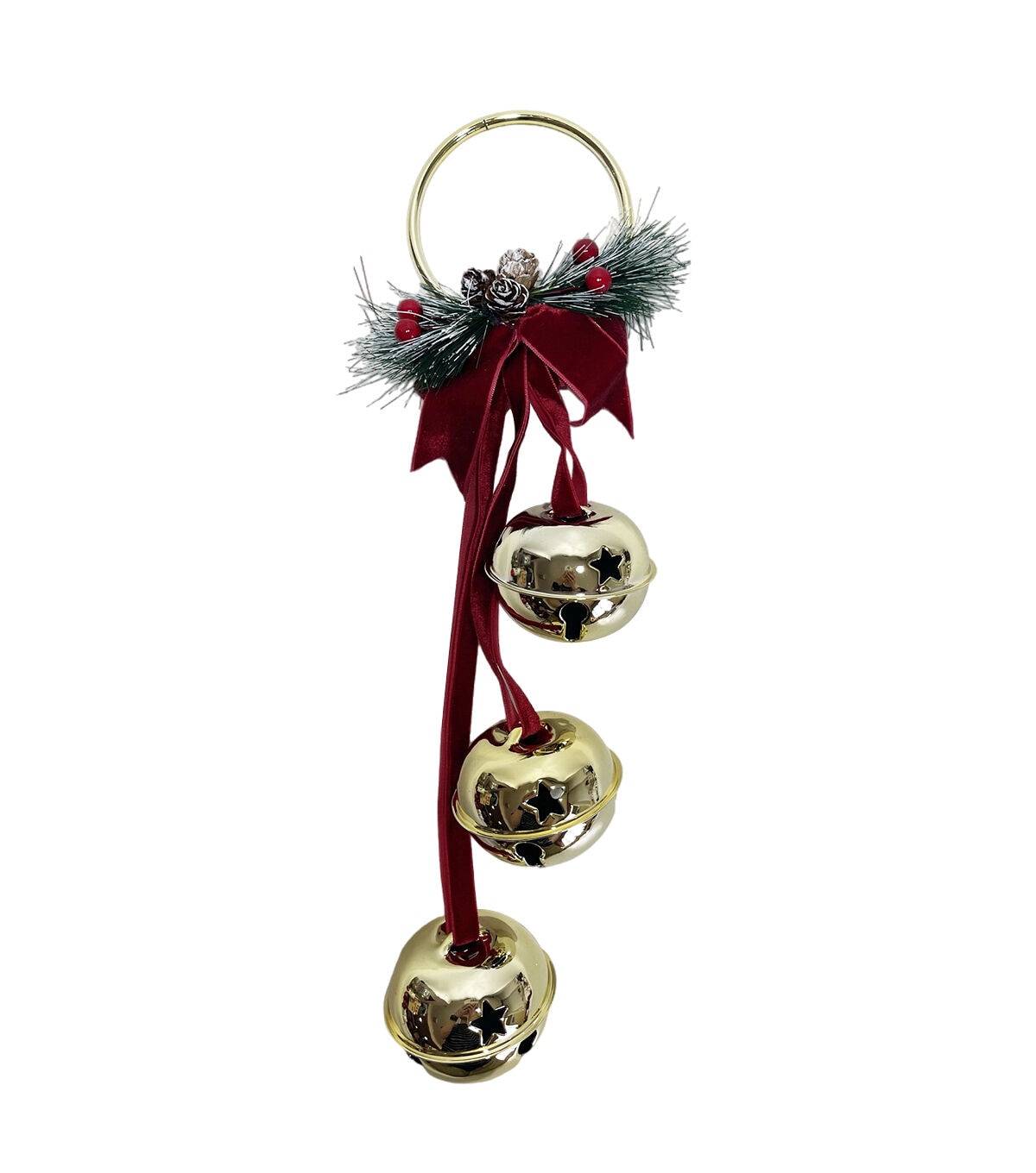 Usher in the festive spirit with the Christmas Cascading Jingle Bells With Bow by Place & Time. Featuring toned jingle bells, pine needles, red berries, pinecones, and an alluring red ribbon, this accent promises both visual and auditory delight. Whether gracing your entryway or any door, it ensures a stylish reception for guests.