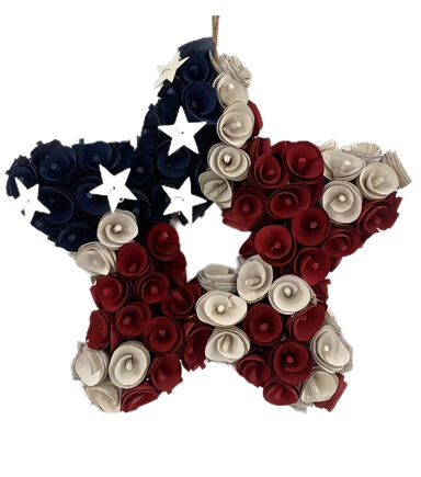 Get your home ready for the Fourth of July with the Patriotic Woodchip Star Wreath by Bloom Room. This pretty star-shaped wreath is made of Woodchip flowers in flag colors and accents shaped like stars. It will look beautiful on the front door or any wall in your home.