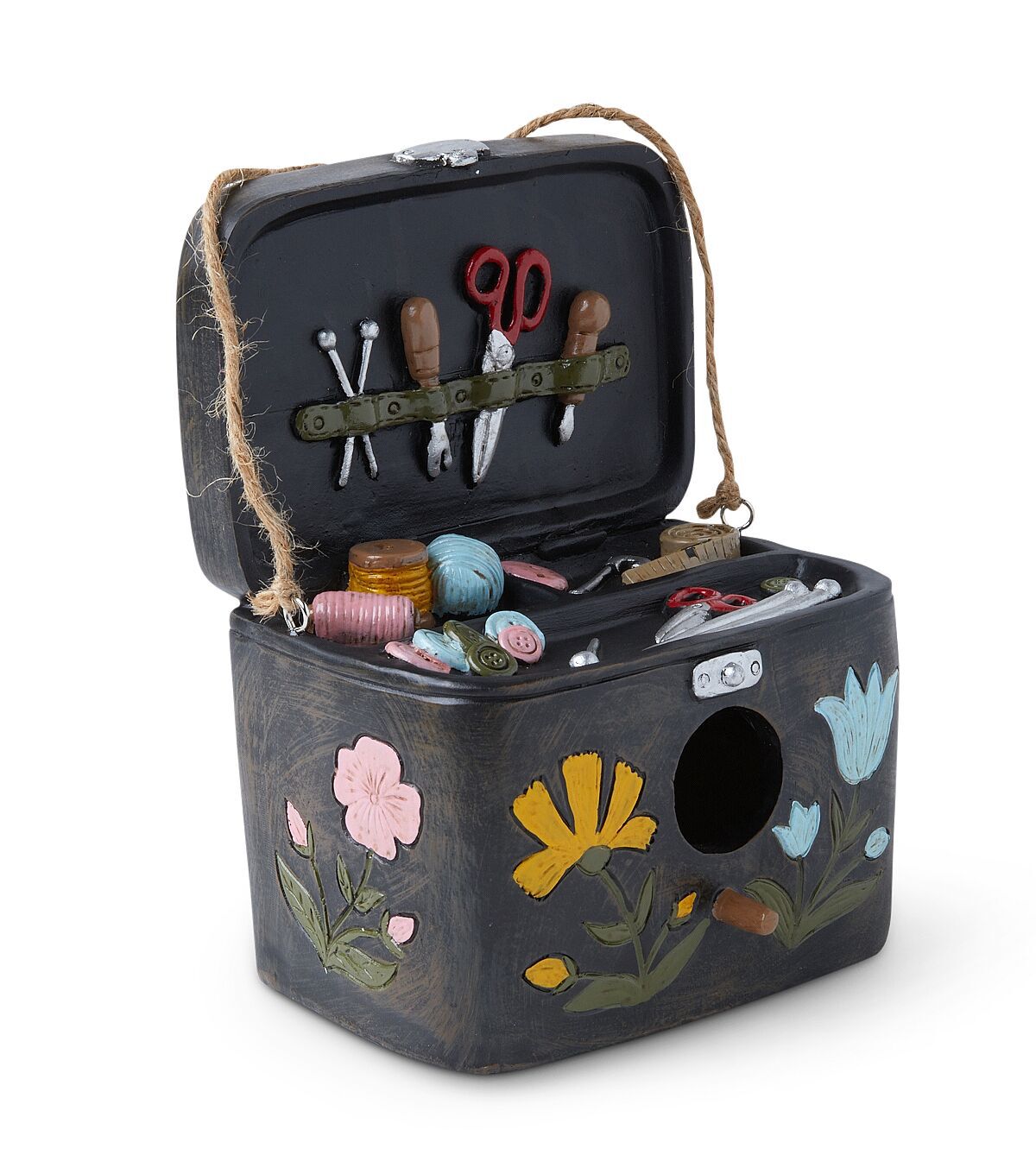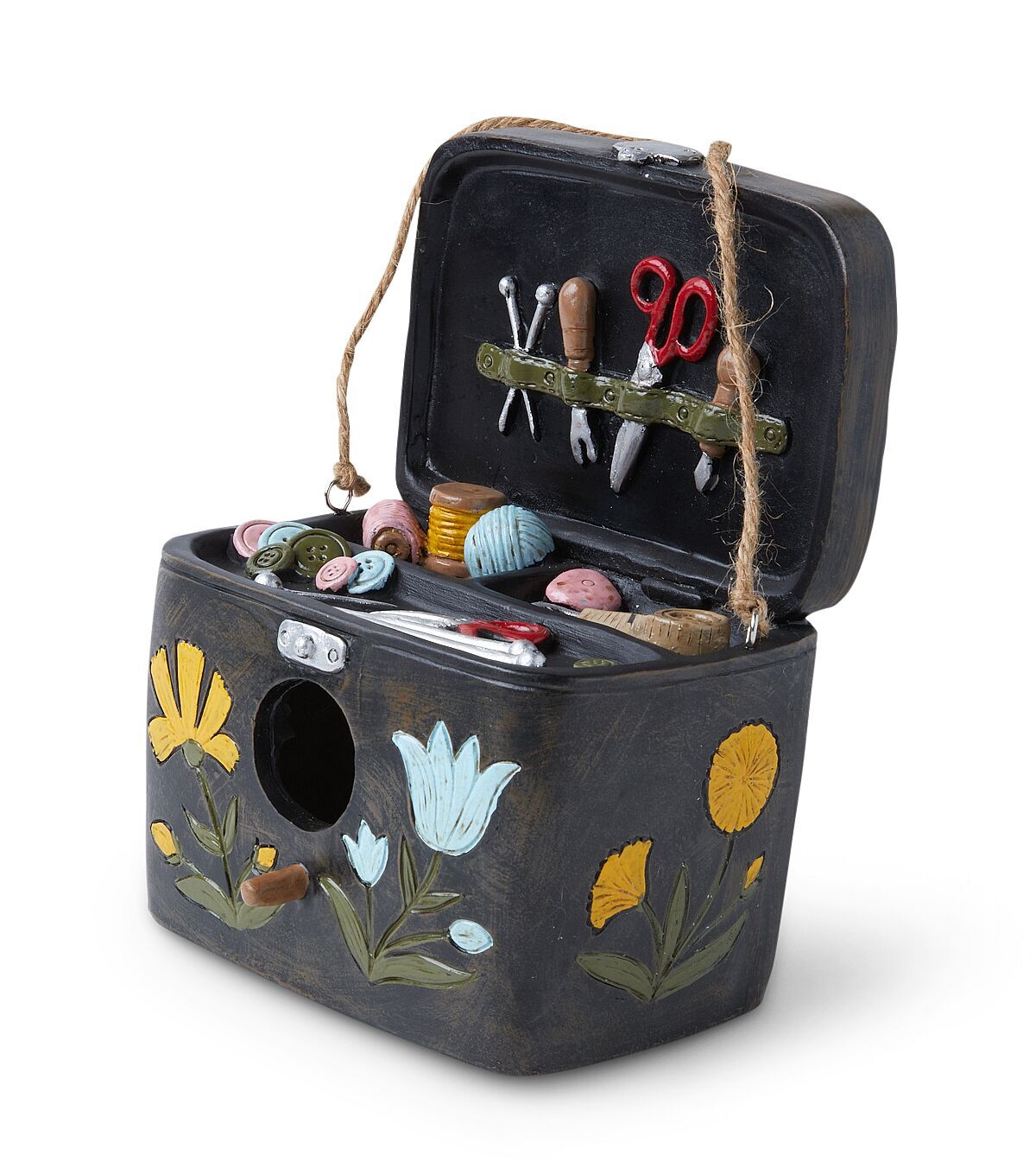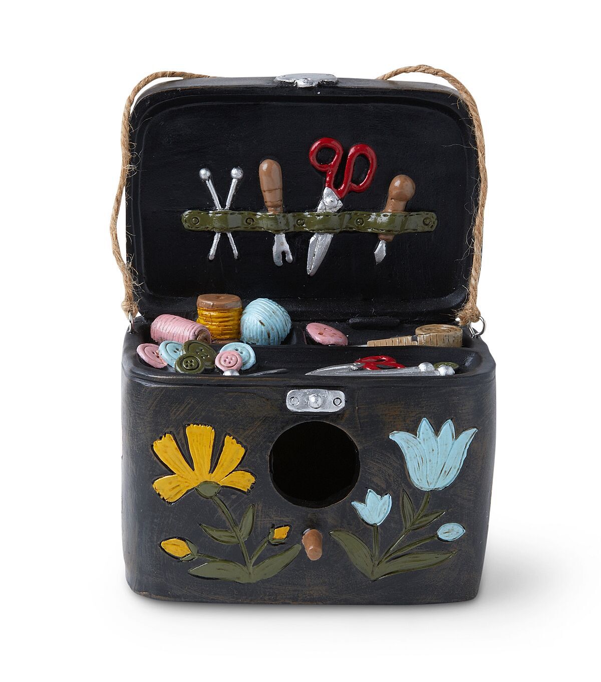 The gorgeous Spring Black Sewing Kit Birdhouse by Place & Time is the perfect resting place for your little birdies. Shaped like a sewing kit with all the necessary tools, this birdhouse will make a quirky addition to your porch, garden or front yard decor. It comes with a string loop for ease of hanging.