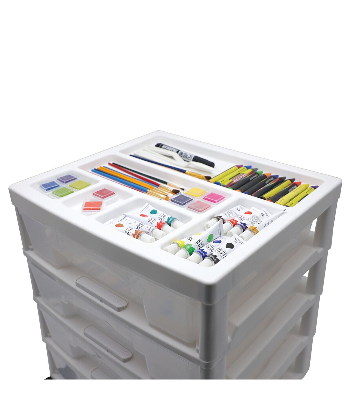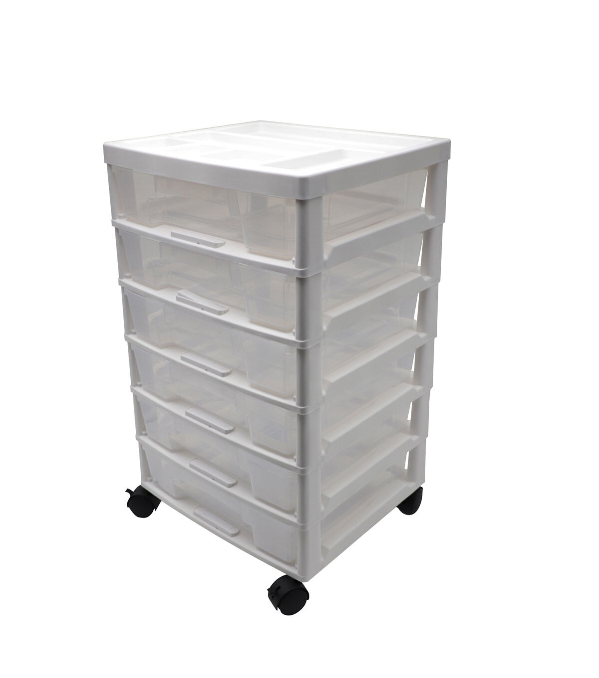 Keep your craft supplies organized and the craft room tidy with the White 6 Drawer Rolling Storage Cart by Top Notch. This storage cart is designed with wheels for easy mobility. It comes with six drawers and a divided organizer tray at the top. You can also use it in the office to keep stationery, mail, files and more.