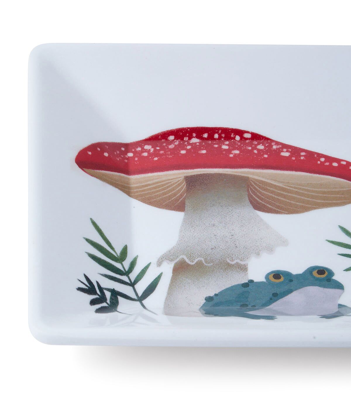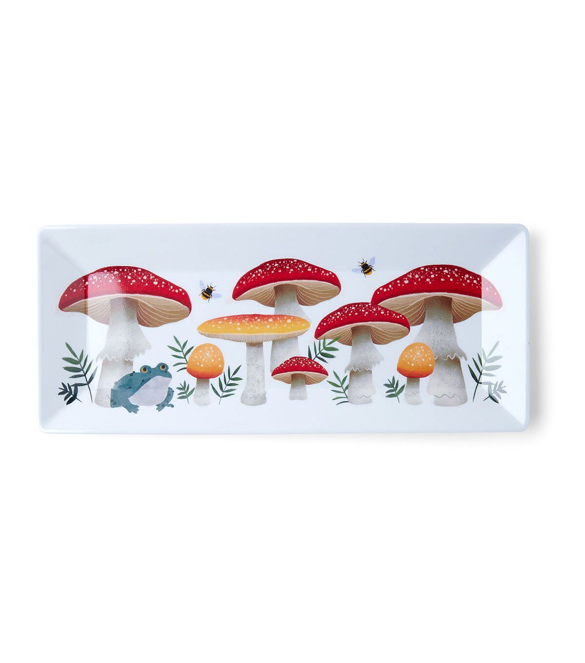 Make your seasonal home decor unique with the Spring Mushrooms on White Tray by Place & Time. This white melamine tray displays a vibrant print of different types of mushrooms, leaves and bees. You can use it to serve hors d'oeuvres or drinks to your guests at a party. It will also make a delightful gift for a great cook you're close to.