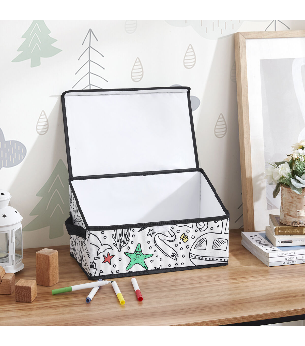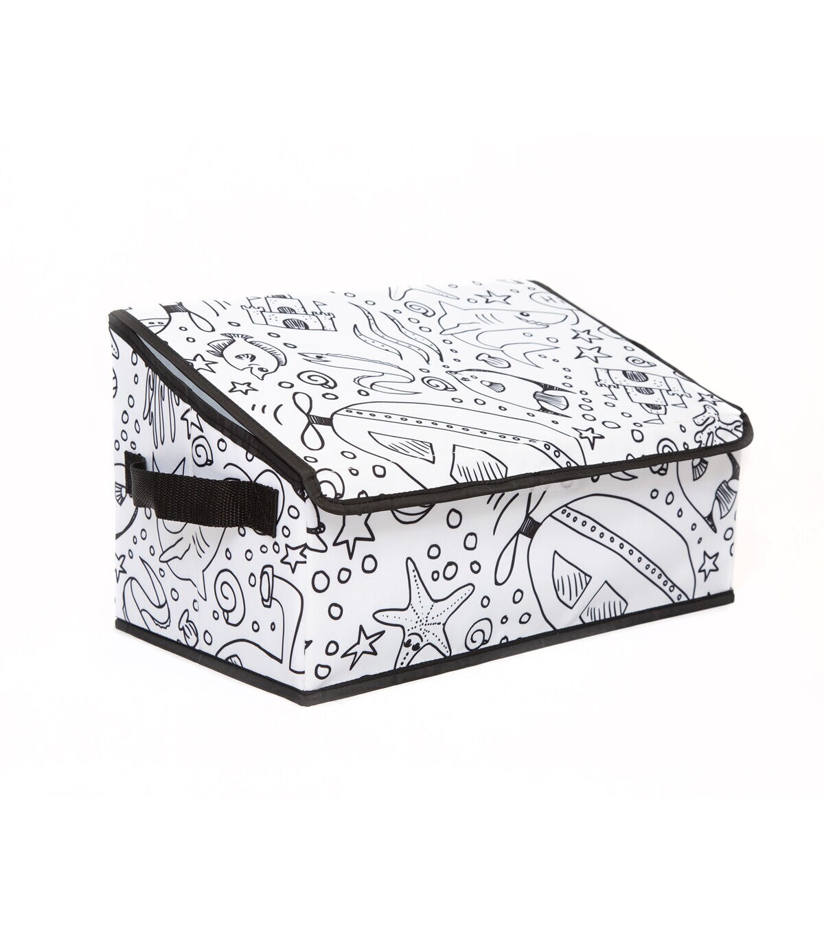 Take your child’s creativity and love of coloring to the next level with the fun interactive design of this Children’s Coloring Angled Storage Bin. This storage bin is constructed of a strong a durable fabric adorned with an out of this world black Under the Sea print just waiting to be explored with washable markers. This multi-functional piece also features a lid to keep contents concealed, durable reenforced handles and a convenient collapsible design for easy storage when not in use