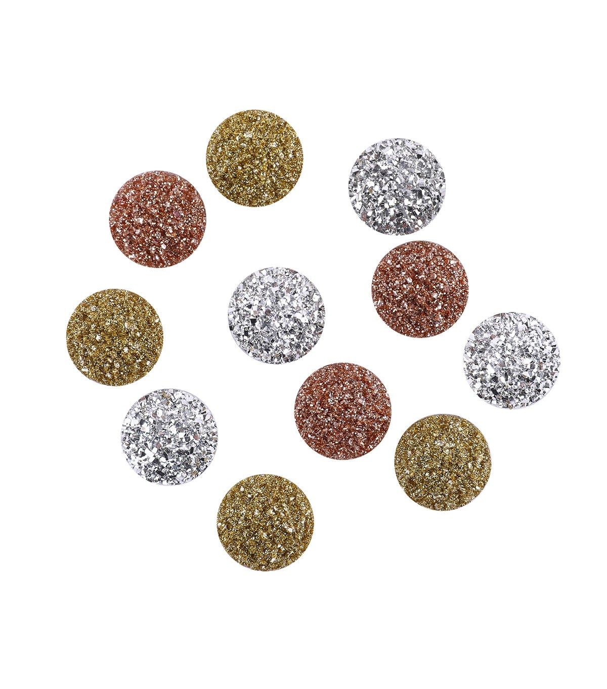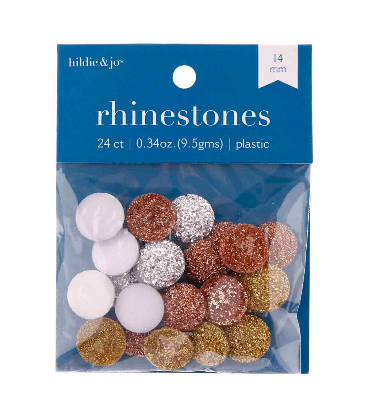 Add a pop of color to your jewelry designs with the hildie & jo Round Plastic Flat Back Rhinestones - Silver, Bronze & Gold. Some of these flat-back rhinestones are covered with glitter for an even more sparkly appearance. Pair them with other coordinating jewelry pieces to make beautiful bracelets, necklaces, anklets and more.