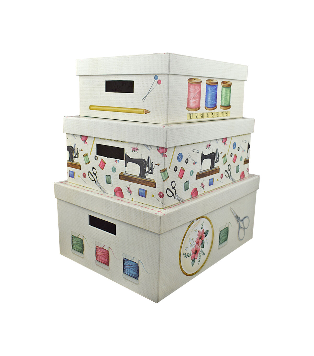 Get a stylish storage solution for your sewing essentials with the Hudson 43 Large Steamer Storage Box - Sewing Notions. It sports a beautiful, embroidered pattern on a piece of fabric within an embroidery hoop, a pair of scissors and spools of thread. The cutout handles make carrying it easy. You can also use it to store books, stuffed toys, photos and more.