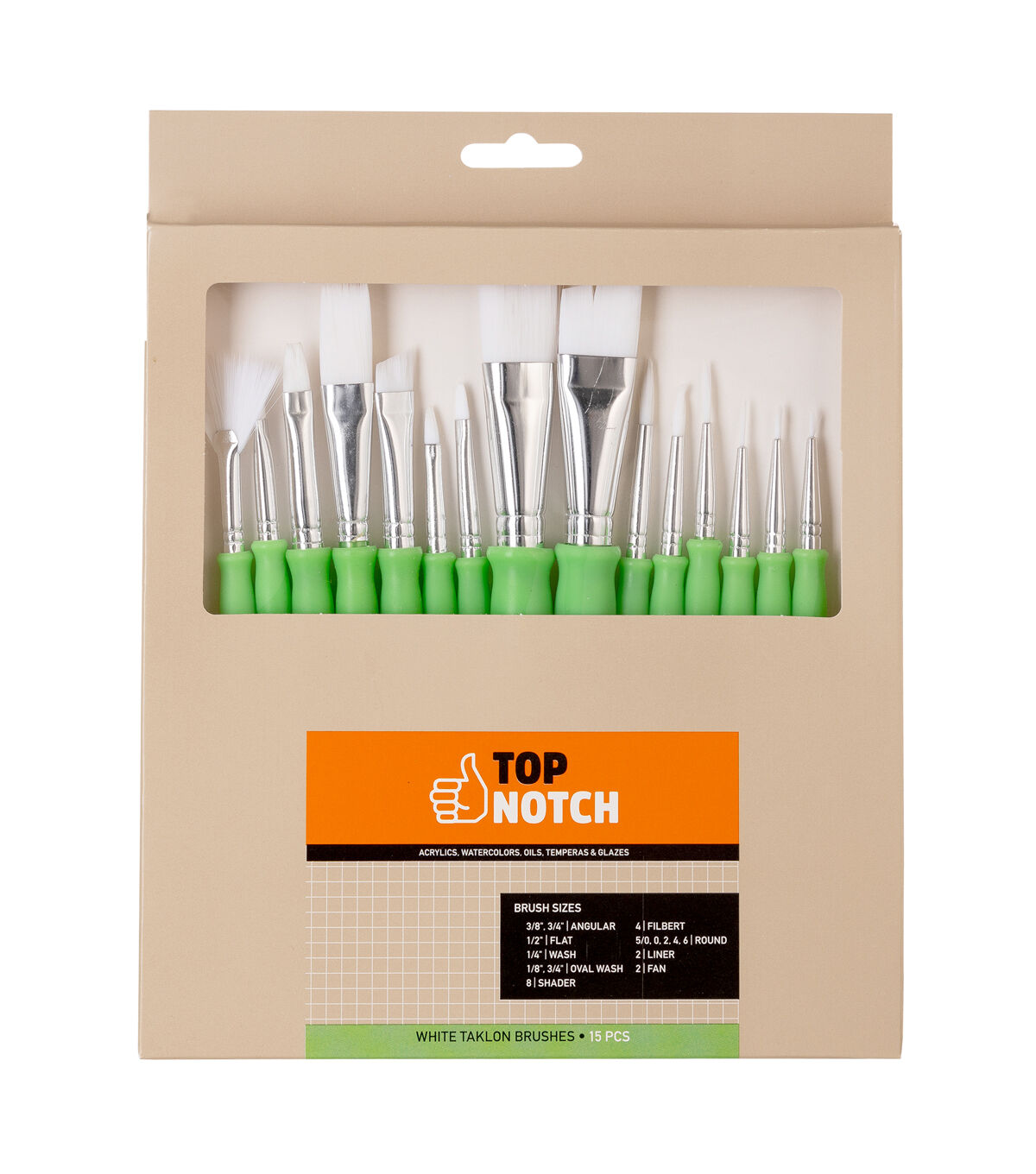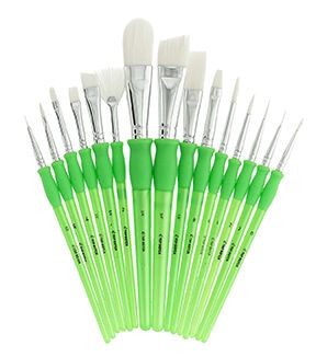 This 15pc set includes many shapes and sizes of brush, features all white taklon hair and plastic handles.