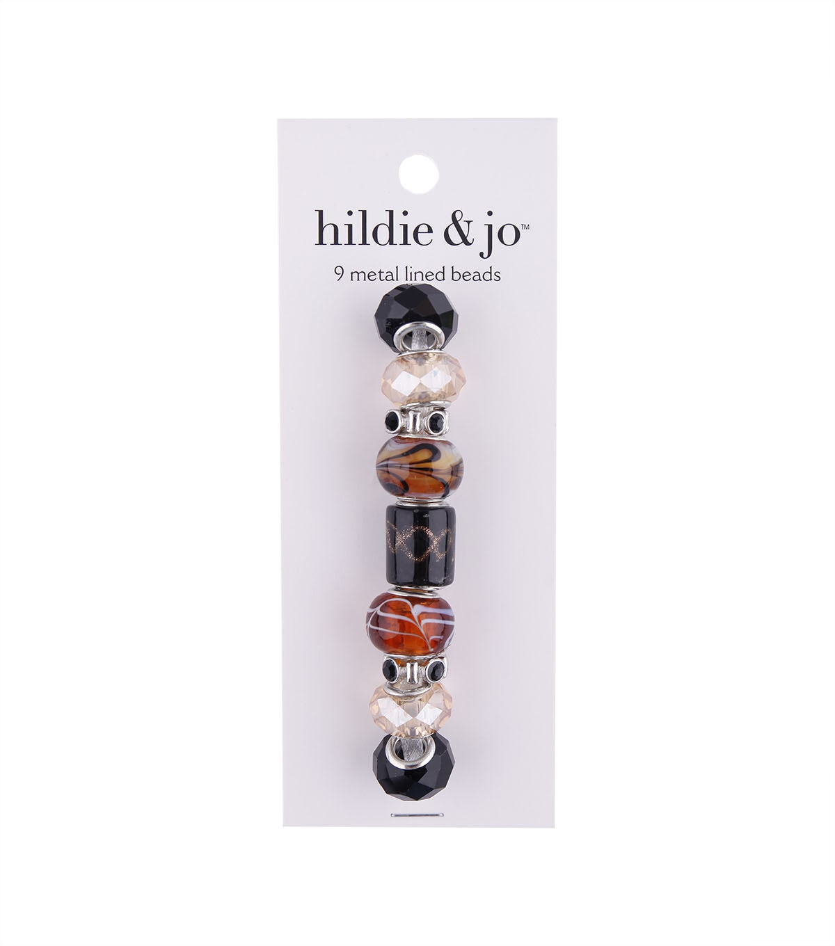 Take up a new bracelet- or - a necklace-making project with the hildie & jo Mix & Mingle Metal Lined Glass Beads - Black & Brown. This pack contains nine 15 mm beads in a black and brown color palette for a beautiful look. The wide holes in these metal-lined beads make it easy to add them to thick cords and chains.