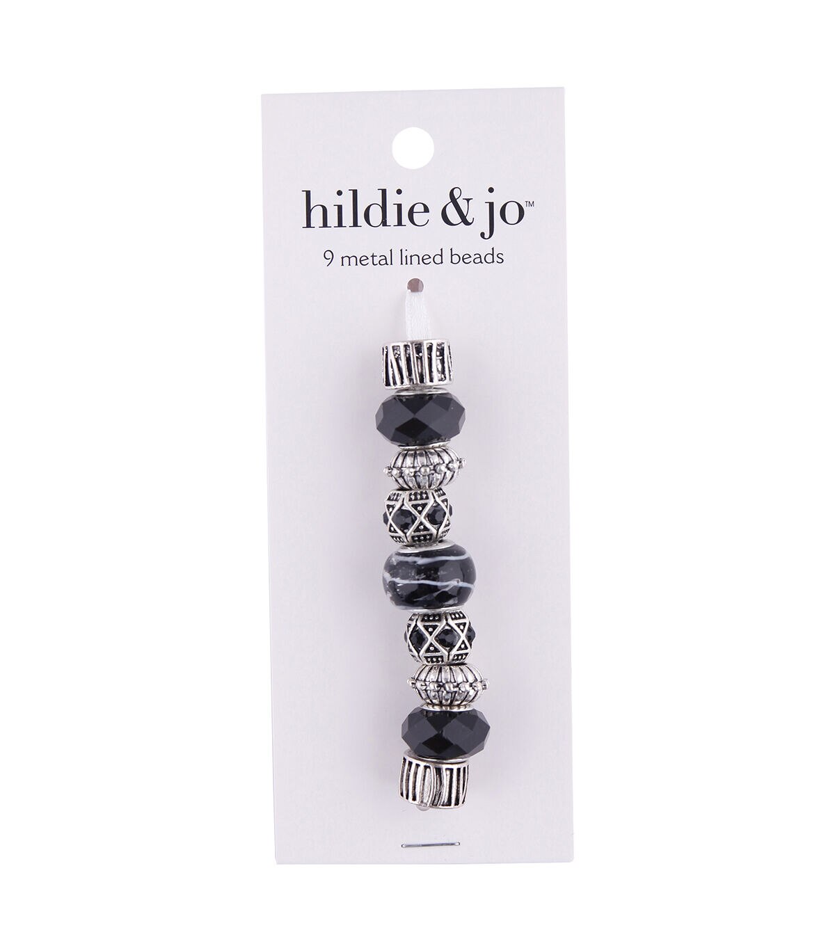 Add the beautiful hildie & jo Mix & Mingle Metal Lined Glass Beads - Black to your jewelry-making projects for a unique look. This beaded string sports nine black beads that are made of zinc alloy, glass and brass. Team these 15 mm mixed beads with other color-coordinated beads, sold separately, to create stunning bracelets, necklaces, armlets and lots more.