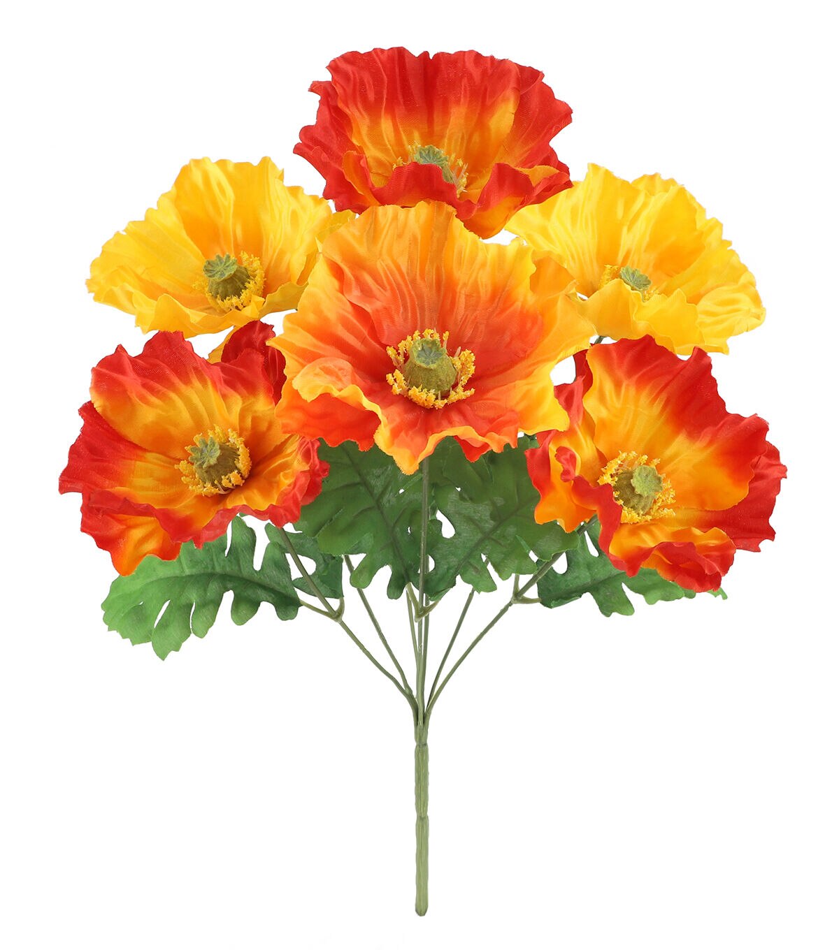 Design a stunning centerpiece by teaming the Summer Yellow & Orange Poppy Bush by Bloom Room with other faux floral stems. It bears beautiful faux poppies in yellow and orange. The green leaves give it a lovely contrasting look. You can also display this faux floral bush in a cylindrical vase on the mantelshelf.