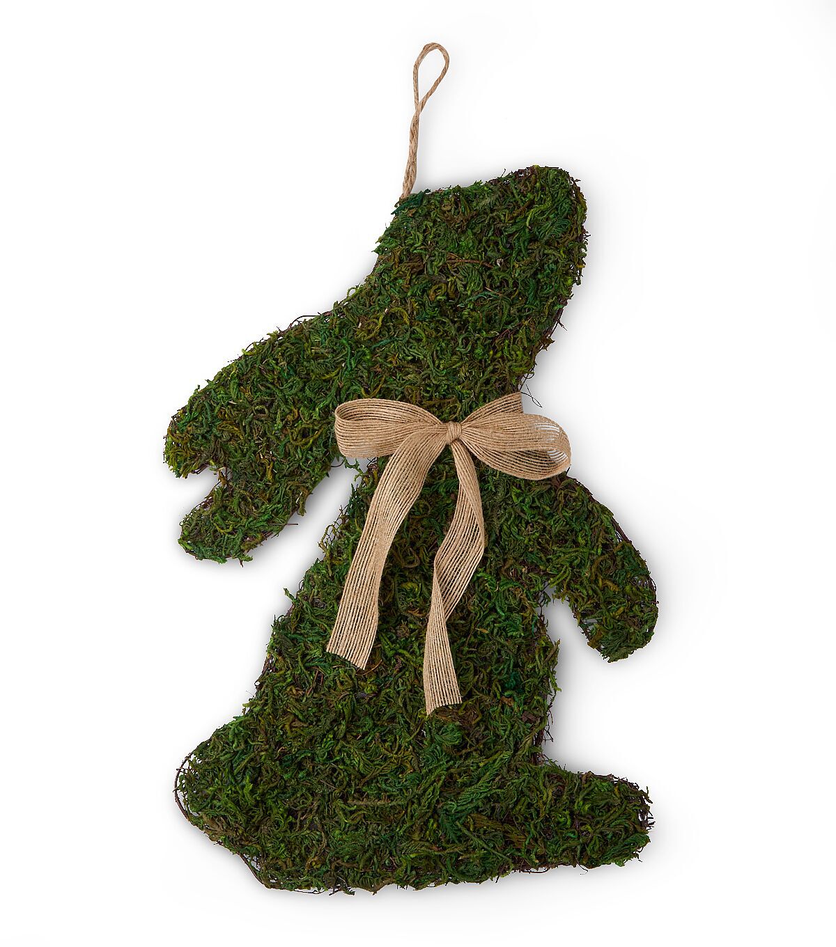 Enhance your Easter home decor with the Easter Green Moss Rabbit by Place & Time. This moss wall hanging is shaped like a bunny and flaunts a green shade. It wears a bow tie around its neck that adds to its visual appeal. A string loop at the top makes it easy to display. You can hang it on any wall in the living room for seasonal charm.