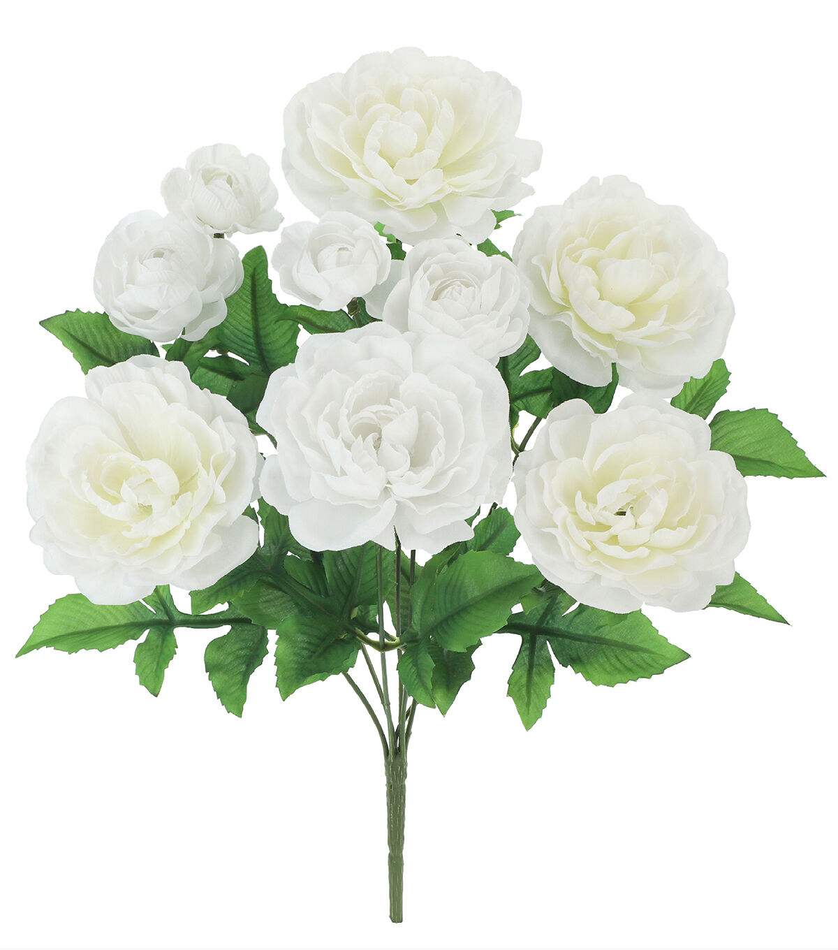 Display the Spring White & Cream Ranunculus Bush by Bloom Room by your bay window or on an end table to make your living space look more appealing. Pretty ranunculus flowers in white and cream shades along with green leaves make up this faux floral bush. You can also use it to decorate a spring-themed gift basket.