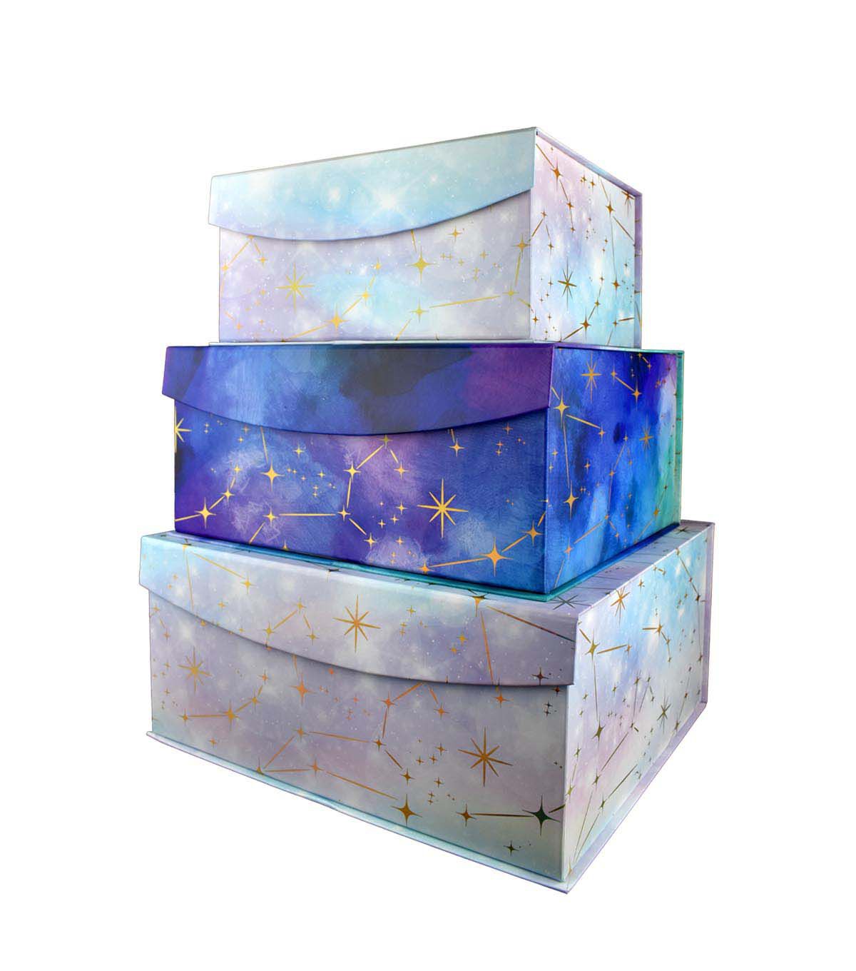 Looking for a fun and unique way to store your belongings? Look no further than the Place & Time 16" x 14" Holographic Gold Foil Flip Top Box. This box is perfect for all ages, with its fun space art and eye-catching holographic foil design. Whether you're storing toys, trinkets, or other small items, this box is sure to add a touch of fun and whimsy to any room.