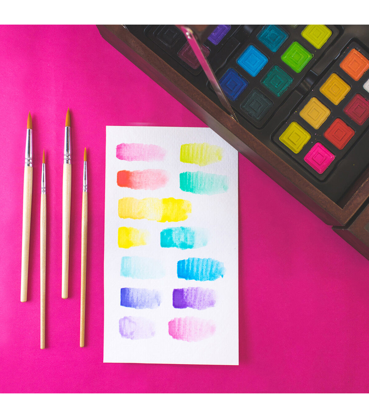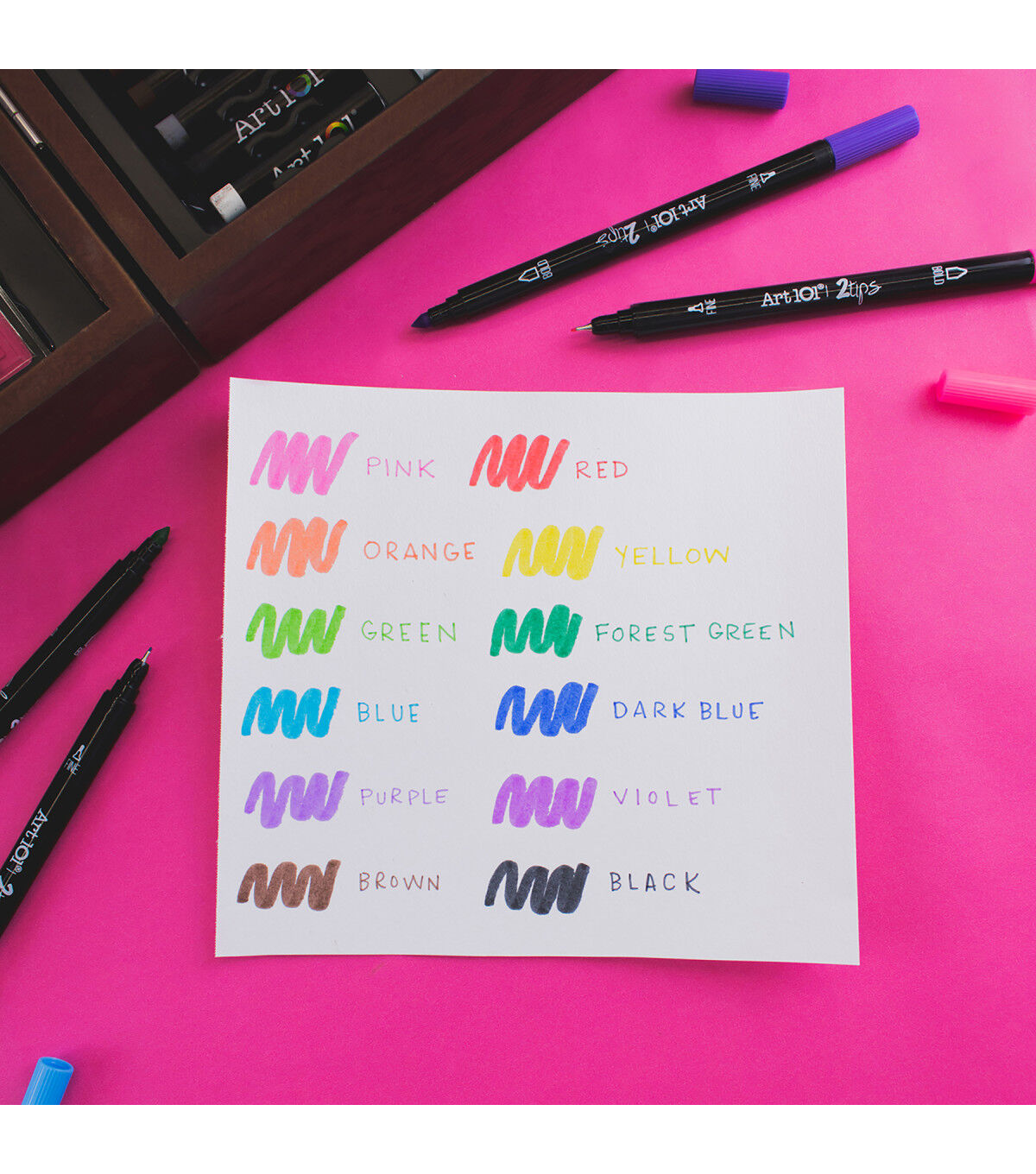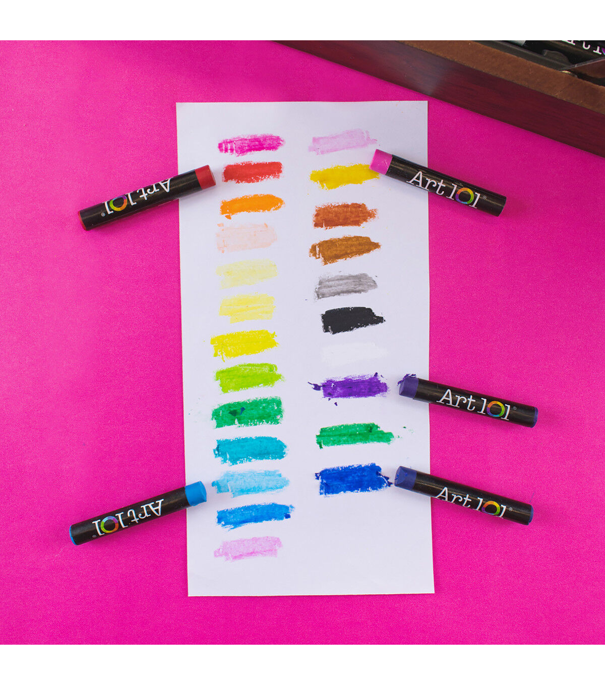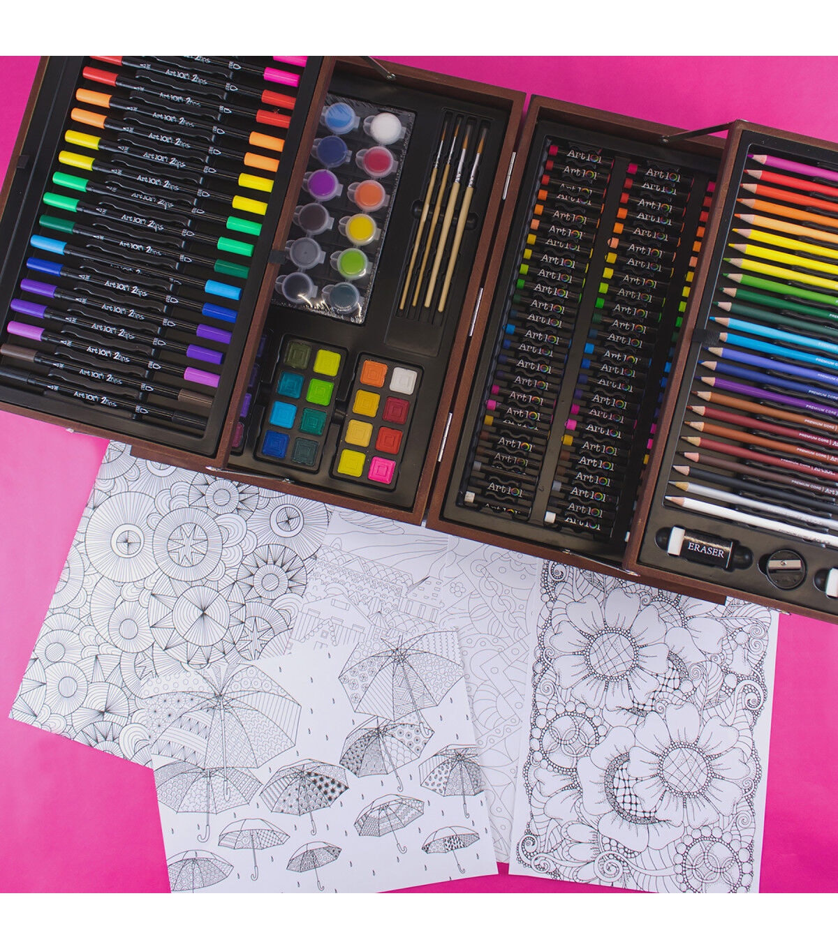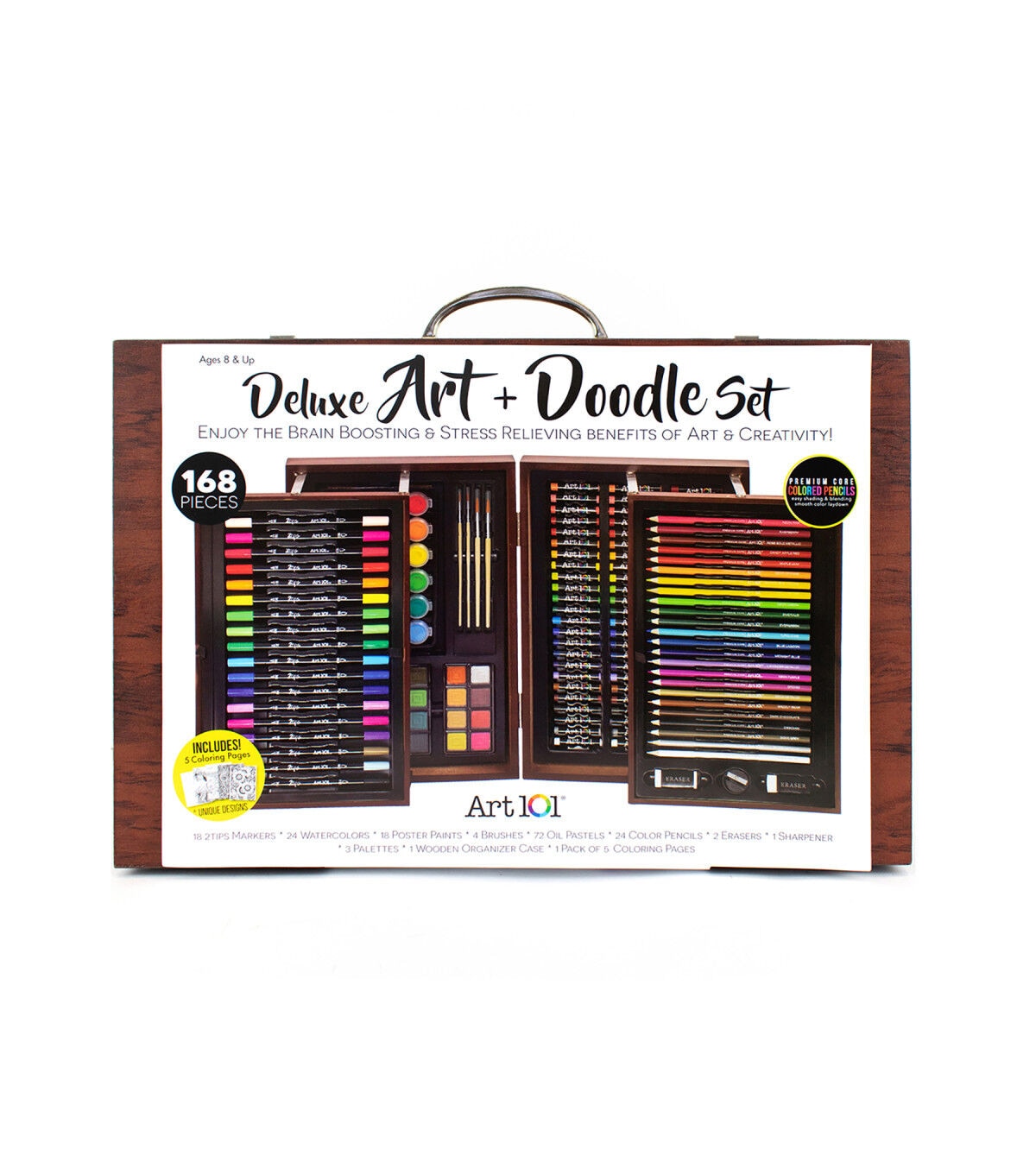 Art 101's 168 Piece Deluxe Art and Doodle Set is the ultimate collection of creative tools for beginner or advanced artists! This set includes 18 of our 2-Tips Markers, which have dual-sided nibs for more doodling and drawing options! Use the bullet nib on one side for coloring large sections, and the fine-tip nib on the other side for adding detail. These water-based markers also are great for hand lettering and calligraphy! Our 168 Piece set also includes a multitude of other mediums for coloring and drawing projects! The 72 creamy oil pastels blend beautifully, and are perfect for still life, portraits, or landscape drawings. Our 24 Premium Core Colored Pencils are pigmented and lay down smoothly on your paper, making them perfect for completing the included 5 coloring pages! This case has you covered for painting, too! Use the 24 watercolor cakes or 18 poster paints on your next school project, new canvas, and more! Additionally, 4 paint brushes and 3 paint palettes are included to give you everything you need to get started. This premium case comes with 4 total trays of supplies in a deluxe wood organizer case, make it easy to pack up your supplies and take wherever creativity strikes!