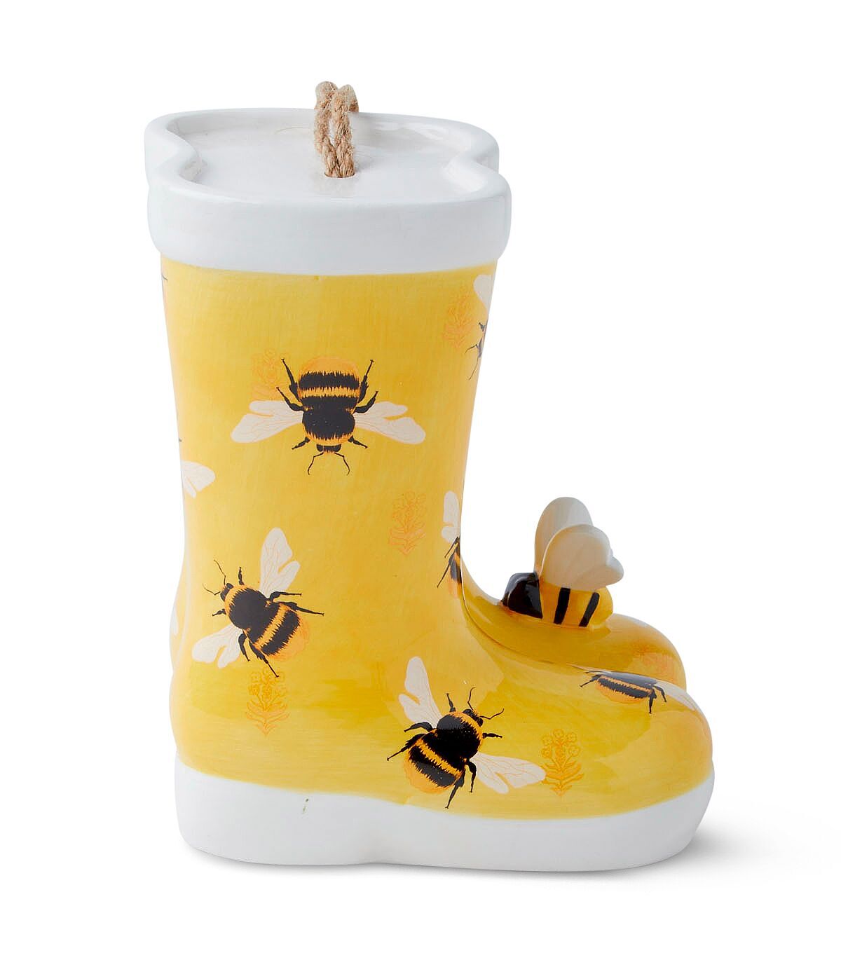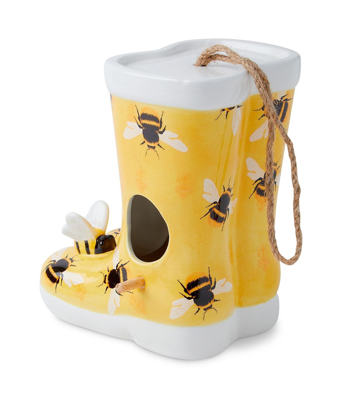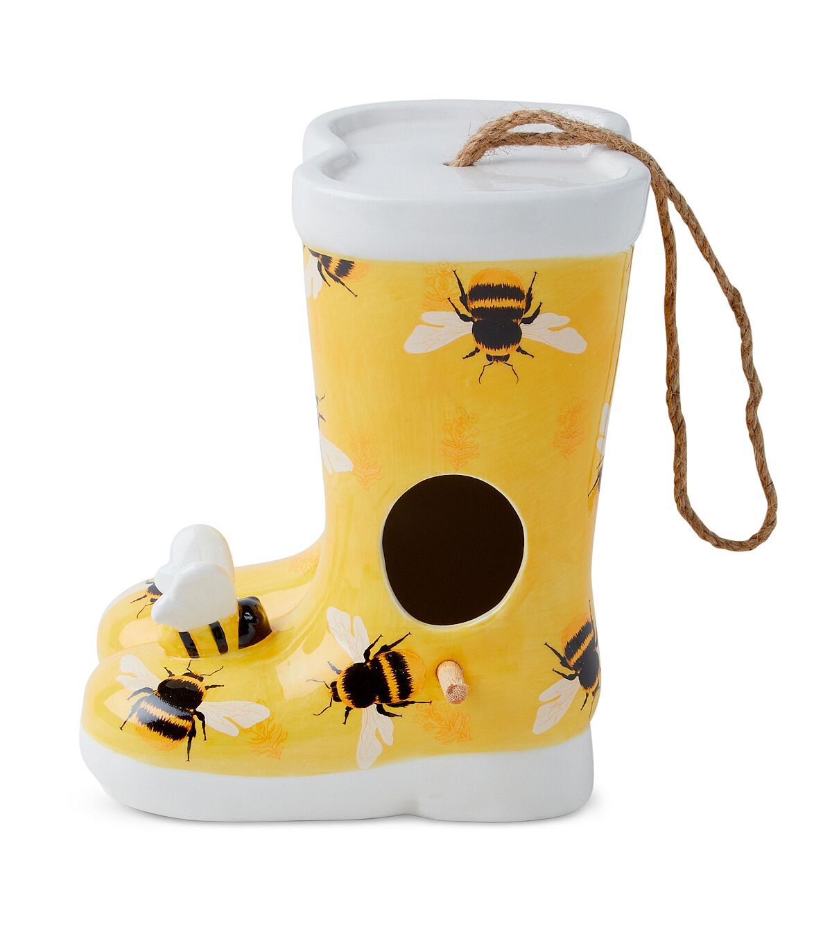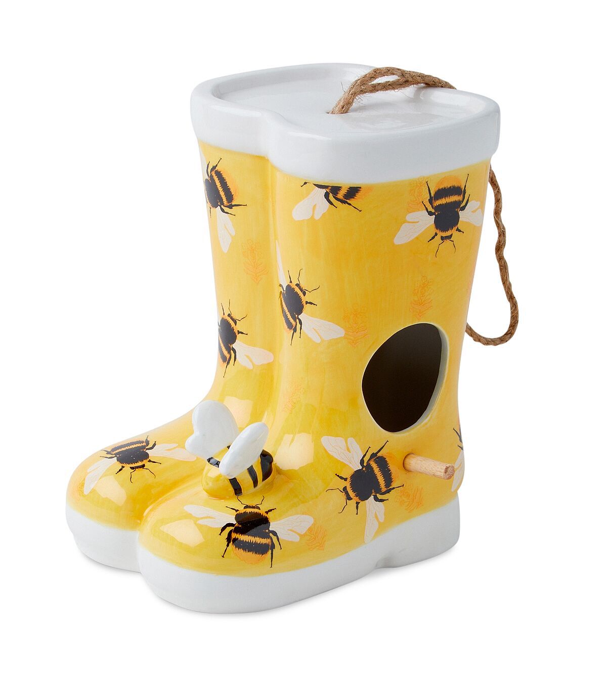 Beautify your garden with the eye-catching Spring Bees on Yellow Ceramic Rainboots Birdhouse by Place & Time. Shaped like a pair of boots and sporting a print of bees, this birdhouse will be perfect for your spring decor. Team it with a bird feeder and birdbath to create a cozy place for your feathered friends.