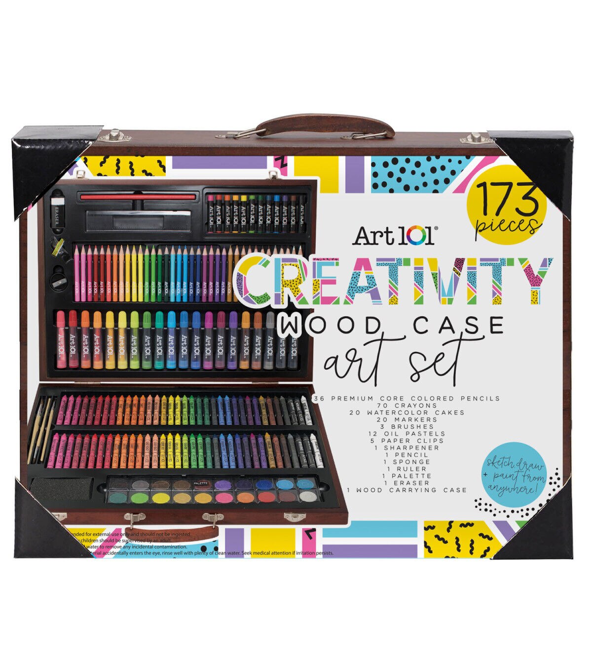 Art 101's Creativity Art Set with 173 Pieces in a Wood Carrying Case includes a variety of artistic mediums for the beginner or advanced artist! Perfect for the young artist who loves to color, this set includes 20 kid-friendly markers that are short and wide, making it easy for little hands to grip and use. The water-based ink formula makes our markers washable off non-porous surfaces. Also included are 70 colorful crayons with fun, memorable names to color and create! Did you run out of your favorite color? No worries! This kit has a couple sets of all of our colors to make sure you have enough to last for all of your coloring sessions. You will also find 36 mini versions of our colorful Premium Core Colored Pencils, which lay down smooth and pigmented on your paper. Build up the color and opacity by varying the pressure on your pencil, and blend different colors together to create different shading effects. Create additional masterpieces with the 12 oil pastels, sketch pencil, or 20 watercolor cakes, all conveniently organized in a wooden carrying case so you can create easily on-the-go!