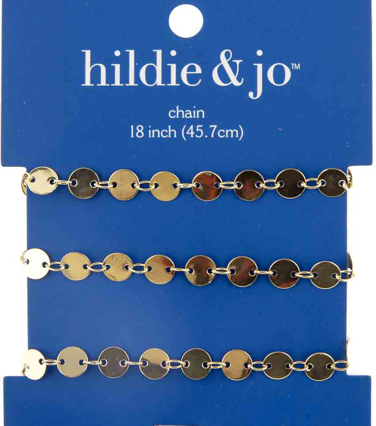 Craft a stunning DIY necklace using this hildie & jo Copper & Iron Round Flat Beads Chain-Gold. The simple yet attractive design of this 18-inch long jewelry chain features small golden discs connected with jump rings.