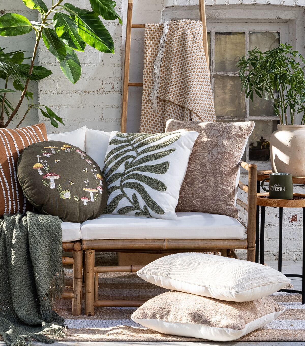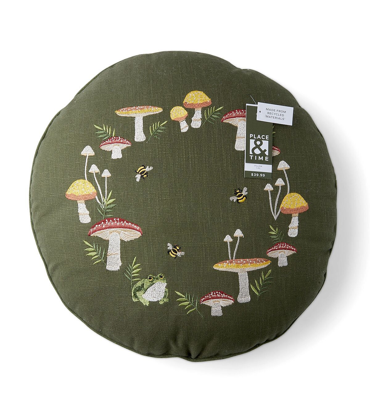 Lend springtime charm to your home decor with the Spring Mushrooms on Green Round Pillow by Place & Time. This round pillow in dark green sports an embroidery of mushrooms, a frog and bees. Team it with pillows in coordinating hues, sold separately, and add them to your living room couch.