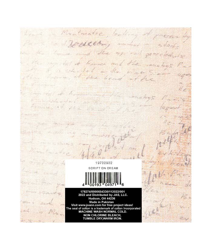 Featuring a delicate script pattern on a cream background, this fabric is perfect for adding a touch of sophistication to any project. And with its generous size, you'll have plenty of fabric to work with. So why wait? Upgrade your fabric collection today with 18" x 20" Script on Cream Cotton Fabric Quarter 1pc by Keepsake Calico.