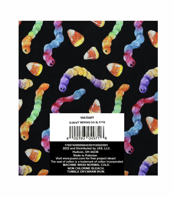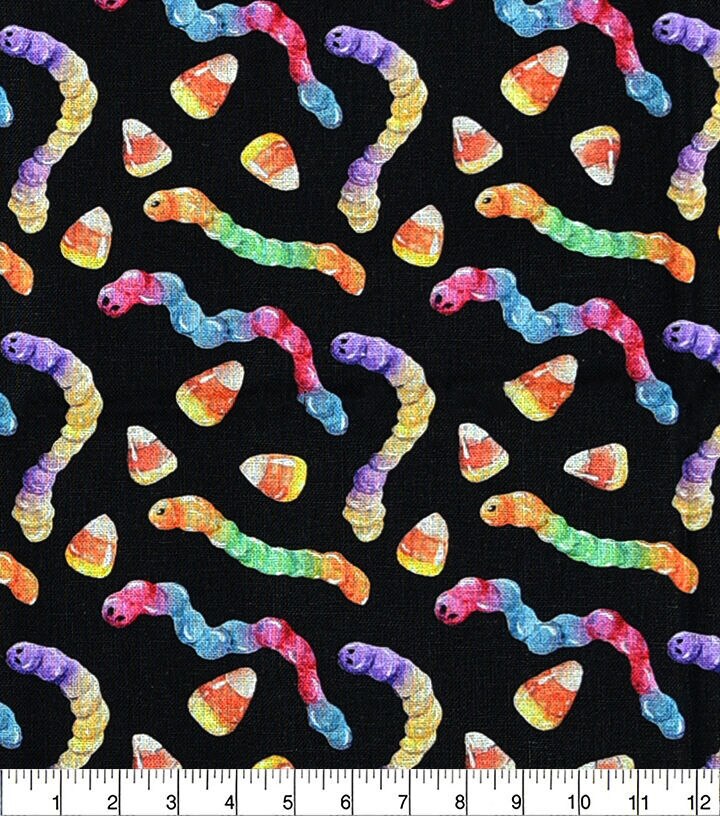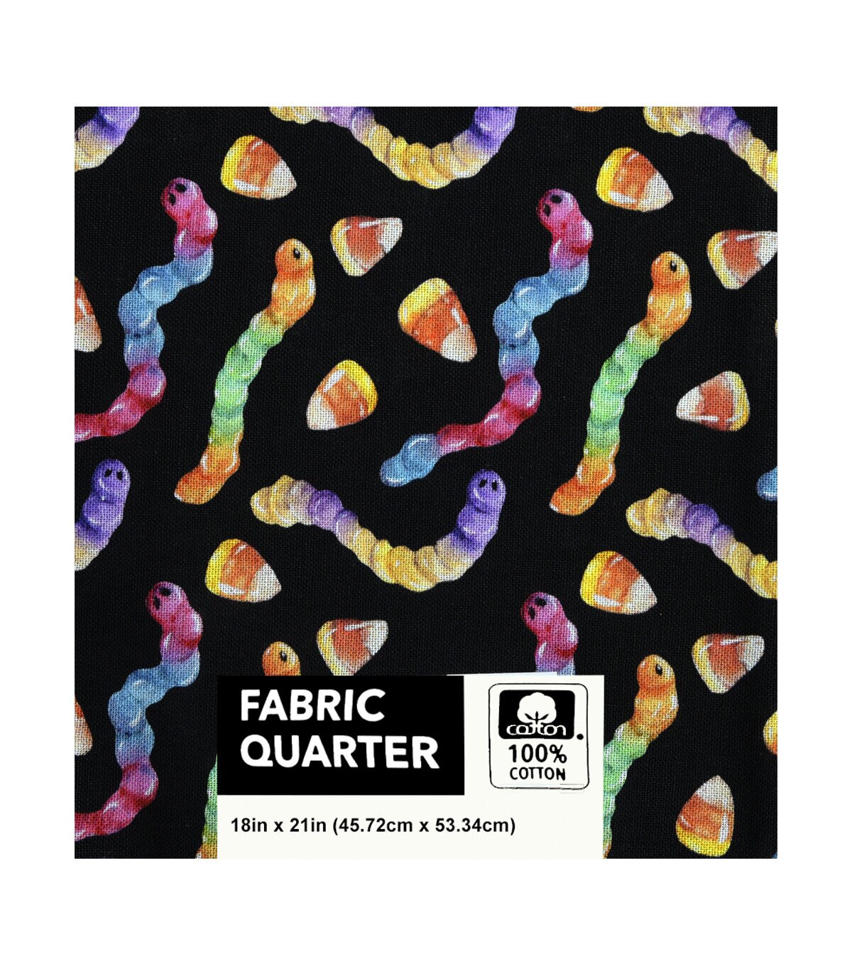 • 18" x 21" Gummy Worms On Black Cotton Fabric Quarter 1pc