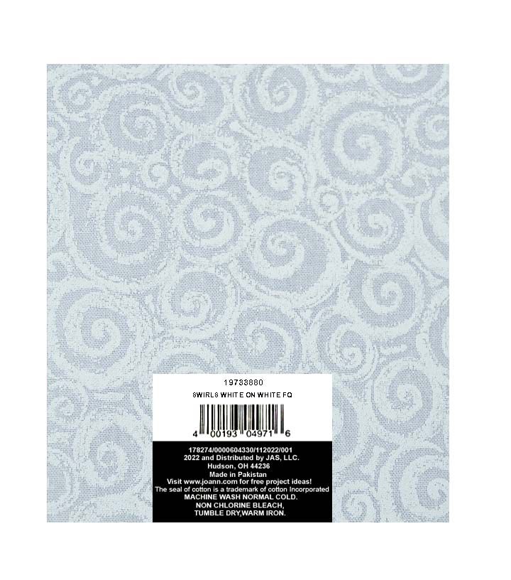Get ready to create something beautiful with the 18" x 21" White Swirls Quilt Cotton Fabric Quarter by Keepsake Calico. This fabric quarter is perfect for all your DIY projects, from quilting to crafting. The stunning white swirls design is sure to add a touch of elegance to any project you create. Constructed with 100% cotton, this fabric quarter is soft to the touch and easy to work with. The imported fabric is machine washable, making it convenient to clean and maintain. Whether you're a seasoned crafter or just starting out, this fabric quarter is a must-have for your collection.