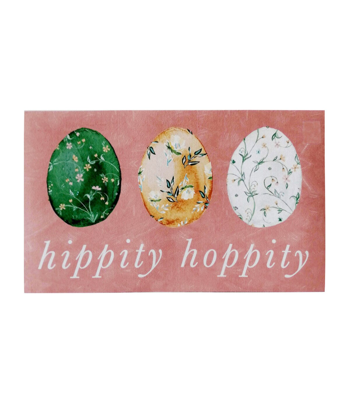 Lend the perfect finishing touch to your Easter home decor with the Easter Pink Hippity Hoppity Rubber Door Mat by Place & Time. This doormat in pink displays a print of three decorated eggs and the words ‘Hippity Hoppity.’ It is made of rubber and will last long. You can place it on the porch or entryway floor.