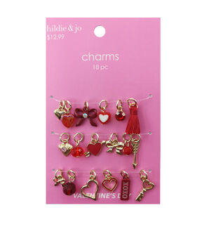 The Valentine's Day Icon Charms by hildie & jo are just what you need for designing jewelry this Valentine’s Day. This pack includes 18 charms, shaped like hearts, bows, arrows and more. Some of the charms sport a gold tone, while the others display a red shade. Use them to make stylish earrings, necklaces, bracelets and so much more. You can also use them to accentuate bags or create keychains.
