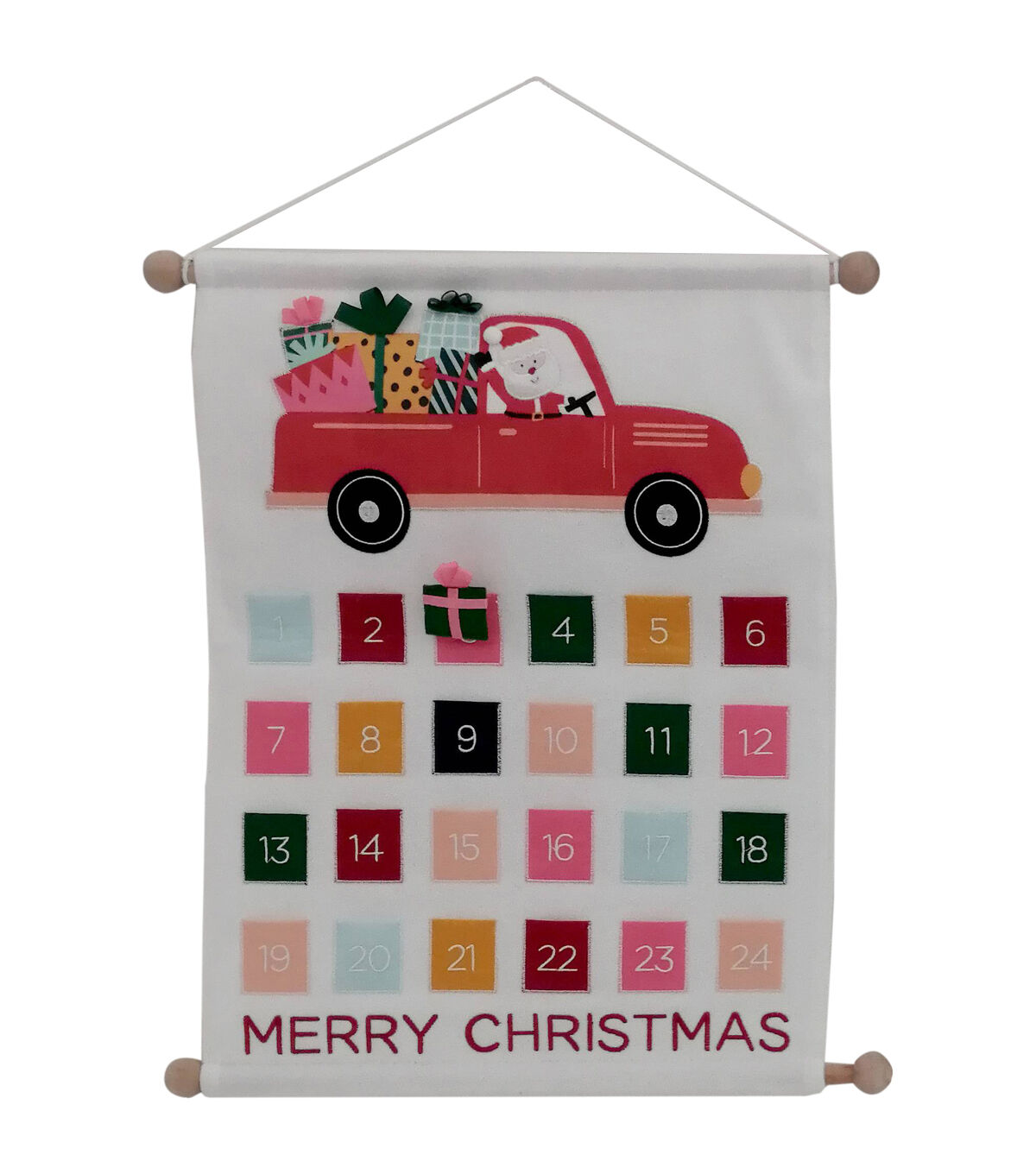 Make every day until Christmas count with the Christmas Fabric Truck Hanging Advent Calendar by Place & Time. This scroll-style countdown calendar is designed with colorful fabric patches with numbers from 1 to 24. It flaunts a print of Santa driving a truck filled with presents and the greeting ‘Merry Christmas’ for added festive vibes. An accent resembling a wrapped gift helps you keep track of the days left. You can display it in the living room or your kid’s bedroom.