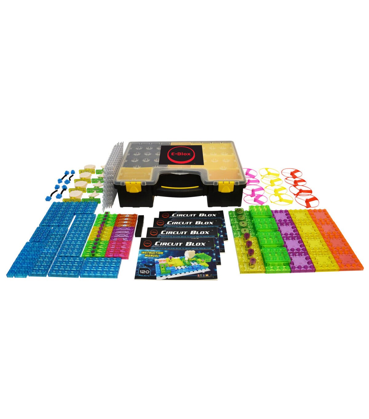 This set provides four Circuit Blox 120 kits (CB-0026), all packed into a sturdy storage case for sharing in the classroom. Each kit provides hours of fun and educational play. The colorful building blocks contain electronic components such as a battery module, switches, LEDs, motor, speaker, IC sound module, amplifier or FM receiver. Each kit builds 120 different 3D circuits that teach STEM and light a star, spin a motor to launch a fan high in the air, play music, sirens and space battle sounds, and even build your own FM radio!