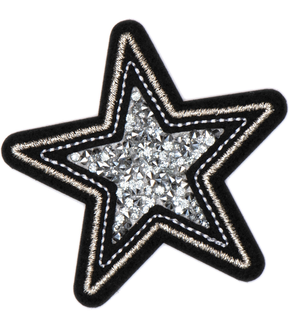 This black and white star applique features silver metallic highlights and a glitter/gem-filled center. It's sure to make any garment or accessory sparkle! Combine with other appliques to create one-of-a-kind designs. Includes one applique, approx. 2.625" wide x 2.5" high. The applique has a heat-seal backing for ironing, but depending on your project it can be applied with glue or sewn onto item for added durability. Easy ironing instructions included on back of package.
