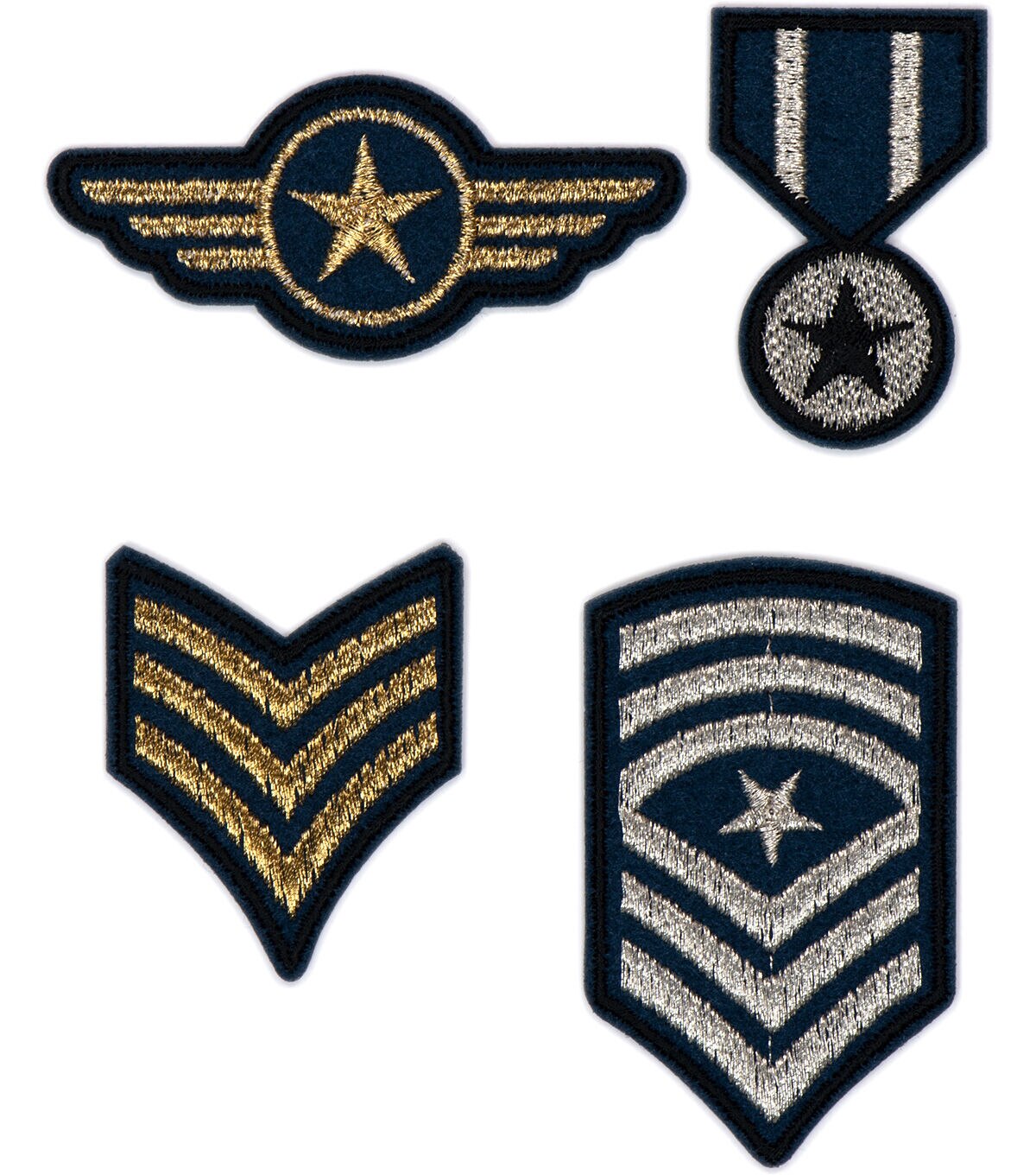 Attach these military-style patches to a jacket, backpack or any DIY project. You can even use them on scrapbook pages commemorating your favorite service member. They feature gold and silver metallic highlights for a shimmer effect. Includes 4 appliques in varying sizes up to approx. 2.5" wide and 2.5" high. The appliques have a heat-seal backing for ironing, but depending on your project they can be applied with glue or sewn onto item for added durability. Easy ironing instructions included on back of package.