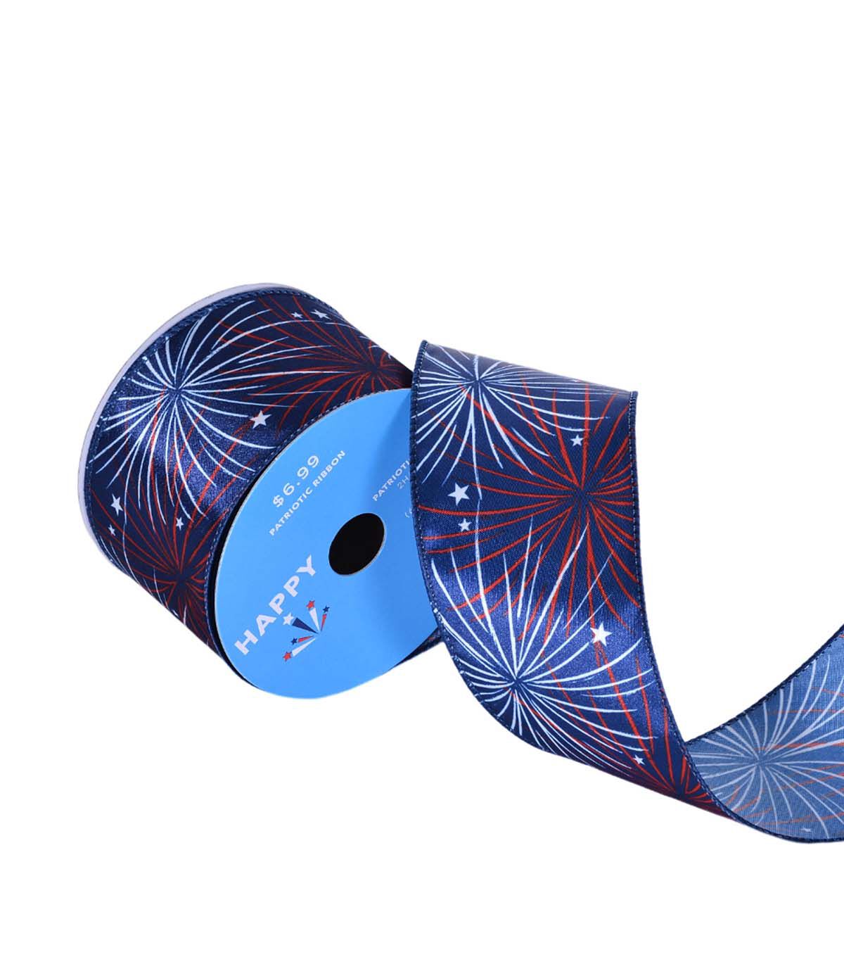 Add a touch of patriotism to your DIY projects with this Happy Patriotic 2.5" x 12' Fireworks on Blue Satin Ribbon. Perfect for Memorial Day, 4th of July, or any other patriotic occasion, this ribbon is sure to make your creations stand out. Use it to make bows, decorate wreaths, or add a festive touch to any craft project. The wired edge makes it easy to work with and create beautiful designs.
