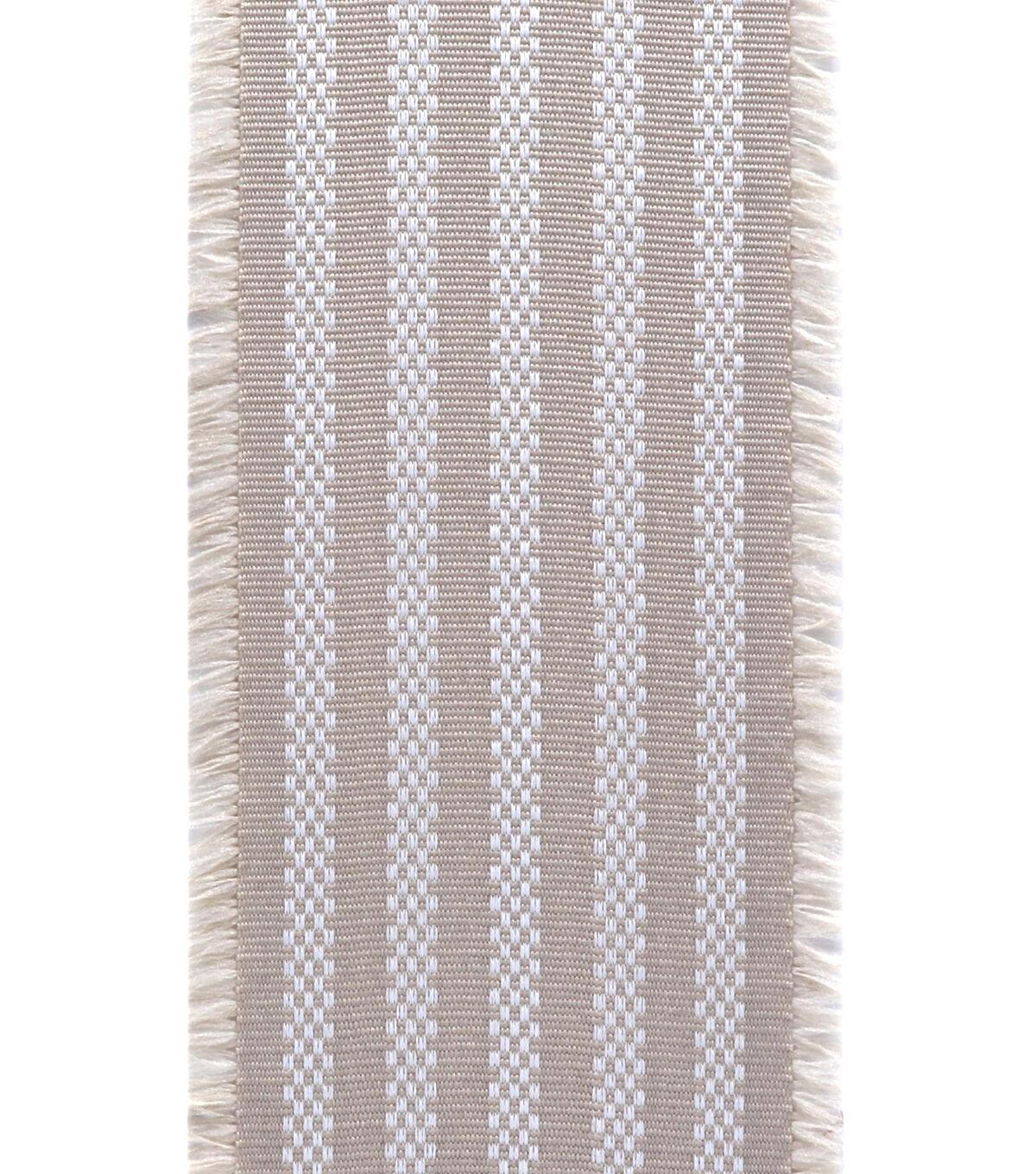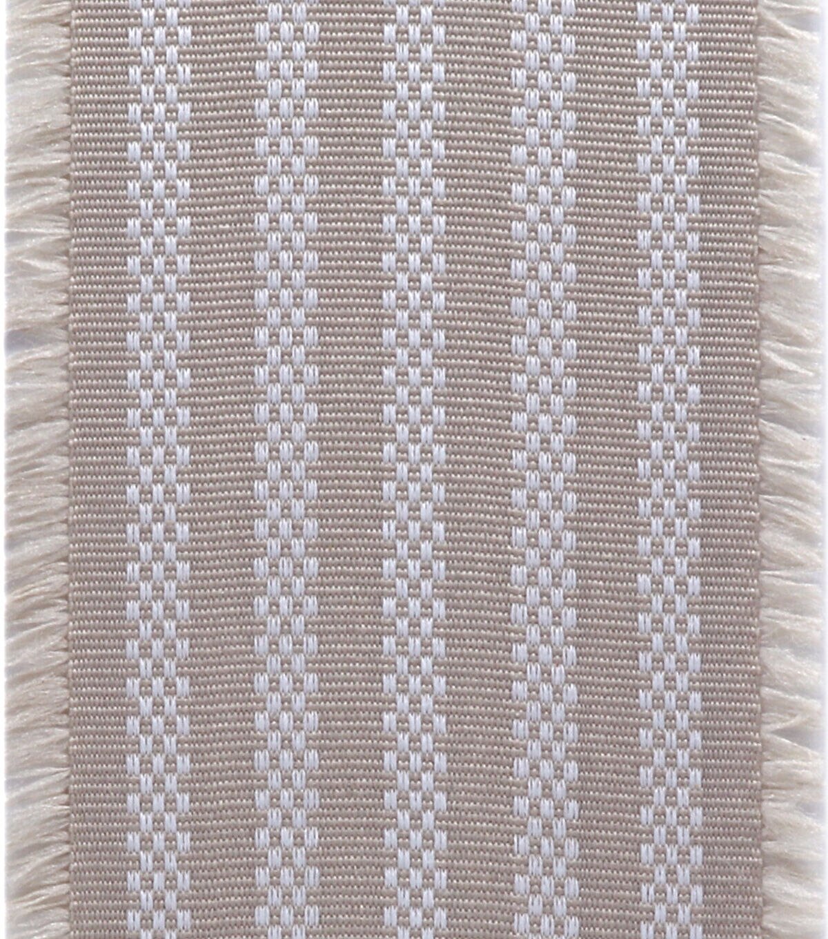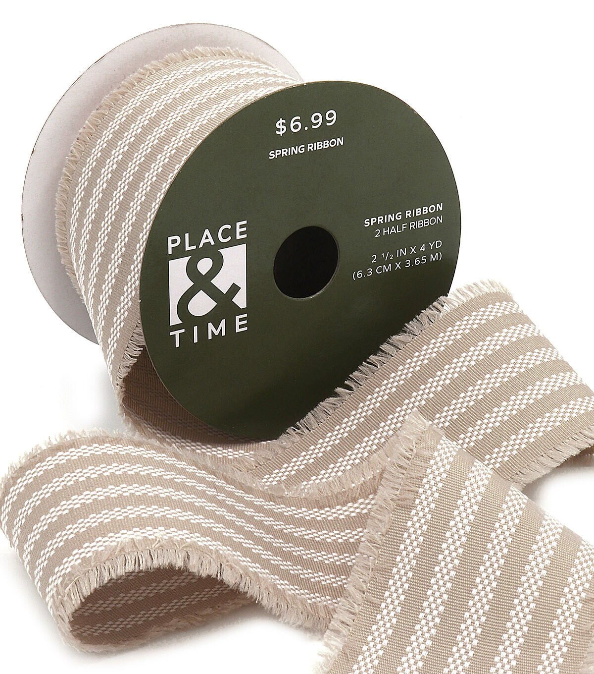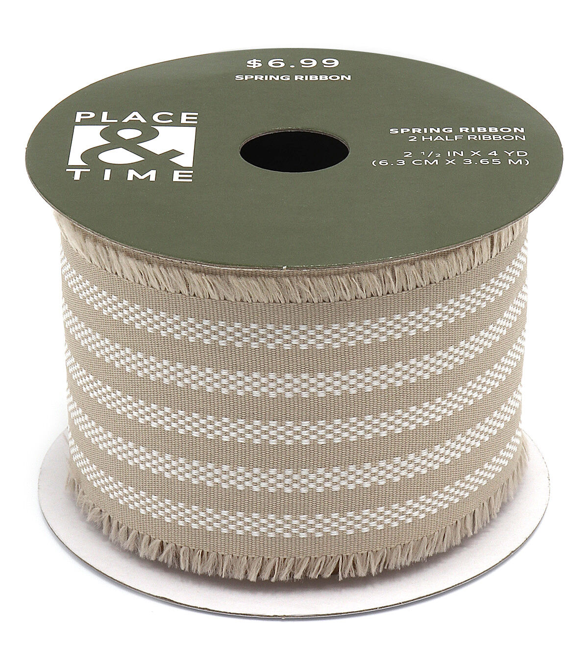 Add a lovely finishing touch to your spring home decor accents with the Spring Tan Striped Fringe Ribbon by Place & Time. It displays a striped pattern in white and tan shades. Use this fringe ribbon to trim wreaths, vases, wicker baskets and more. You can also team it with linen ribbons in colorful hues to create a stunning ribbon chandelier for the front porch.