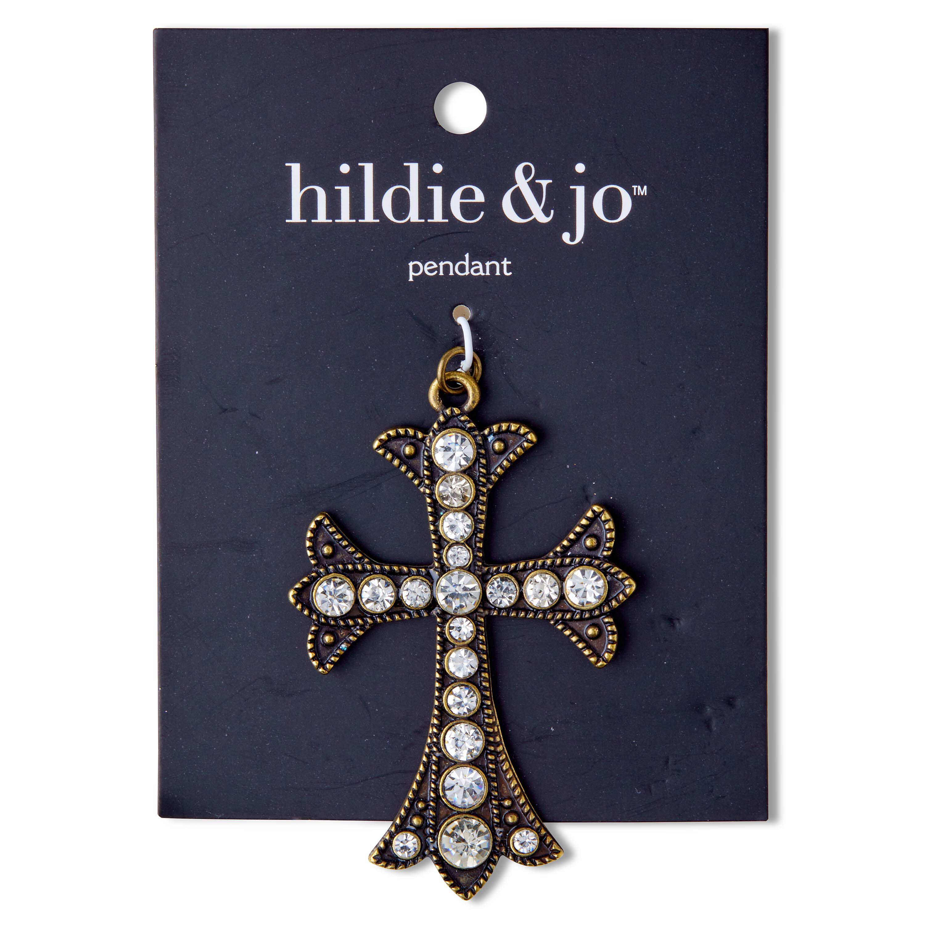 Showcase your faith with the sparkly hildie & jo Cross Antique Gold Pendant-Clear Crystal. Designed in antique gold, the edges of the pendant sport a dotted pattern and the arms have a Fleur di Lis pattern at the ends. The center of the cross have round, clear crystals in various sizes. Attach it to your chain to add even more pizzazz to your DIY design.