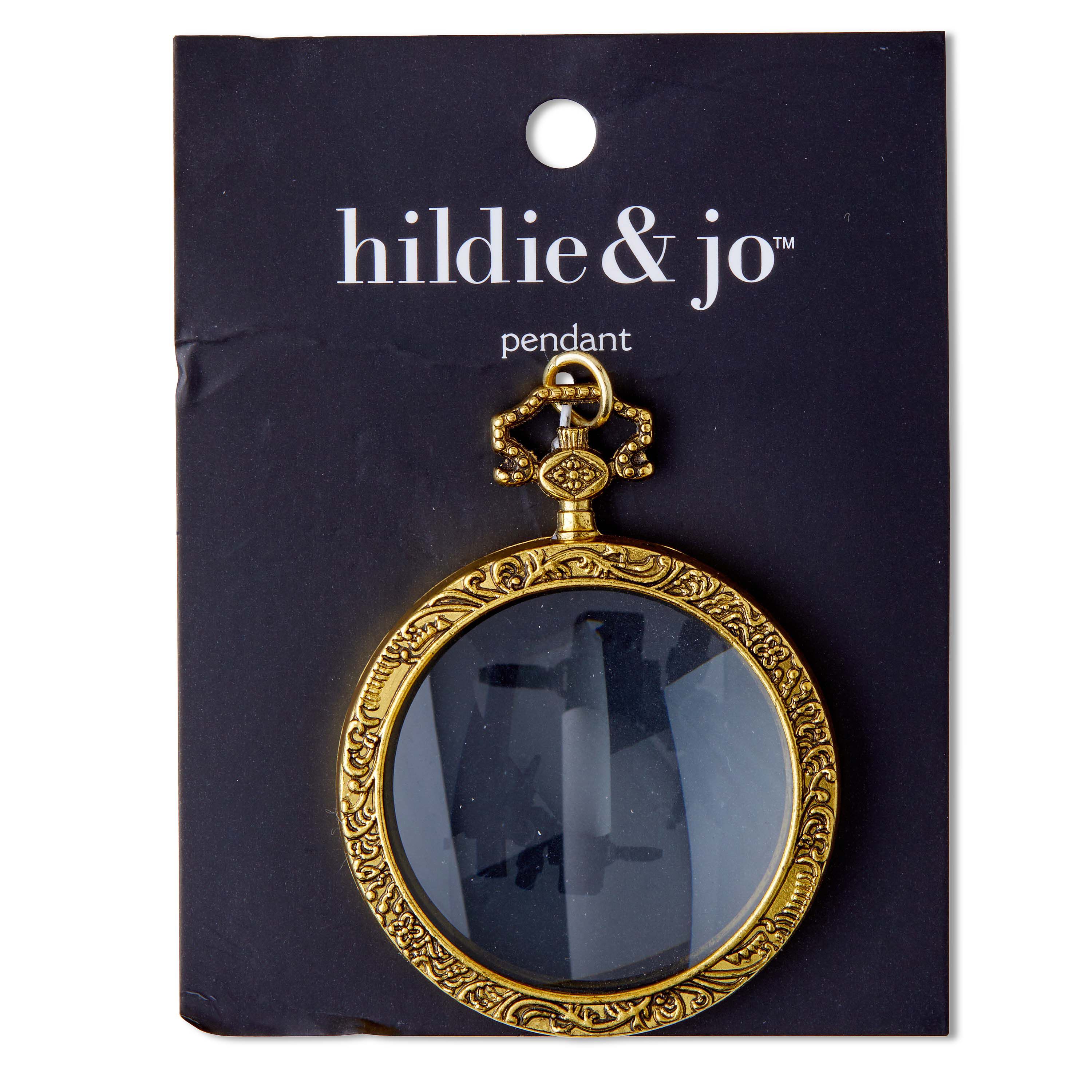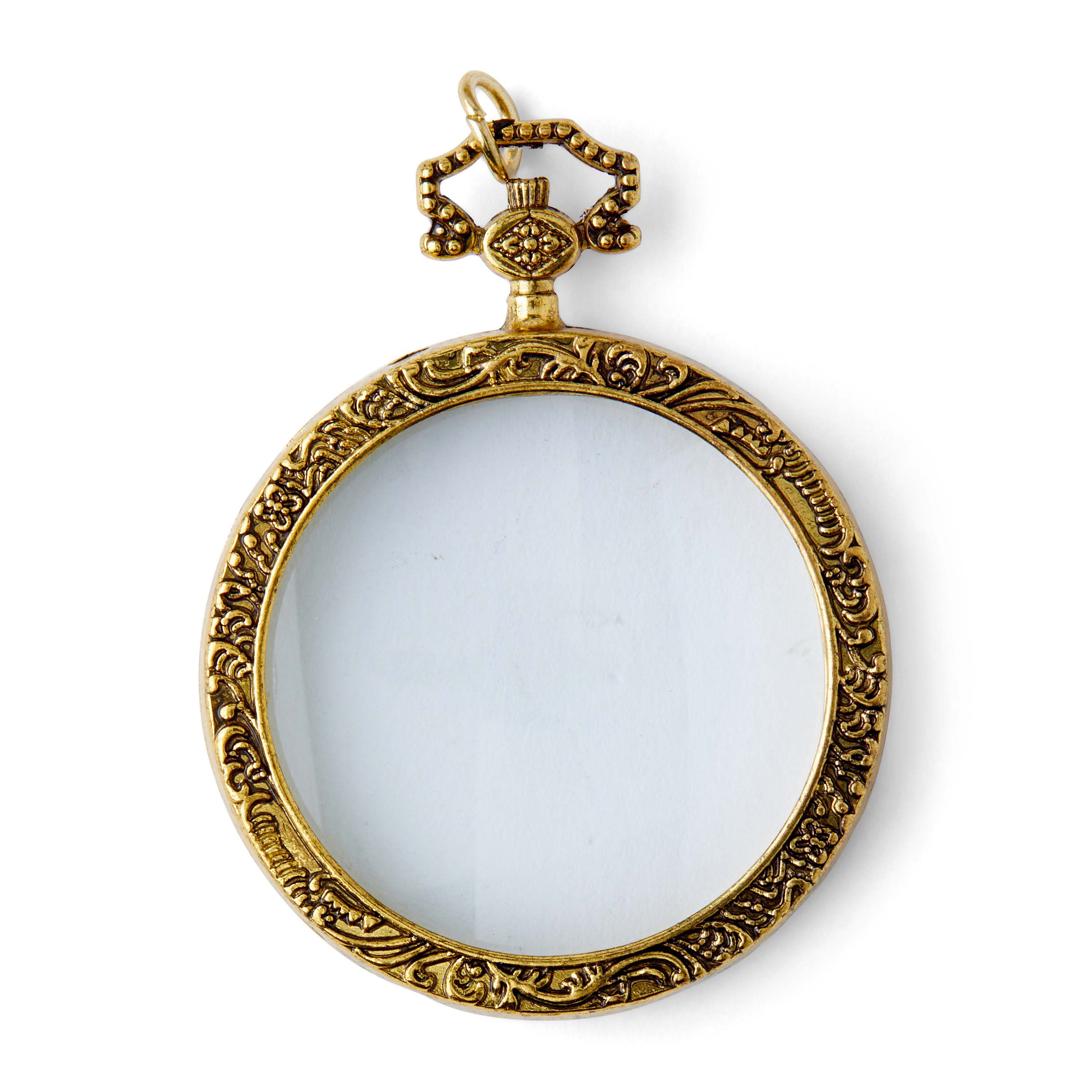 Unveil your style in a minimalist flair using the hildie & jo Antiquist Antique Gold Pendant-Clear Round Glass. This crystal clear pendant features a beautiful dot pattern on top. Below is a clear round glass that is surrounded by antique gold, which exhibits a detailed scroll pattern for visual flair. Add this pendant to bracelets, necklaces, key chains and more.