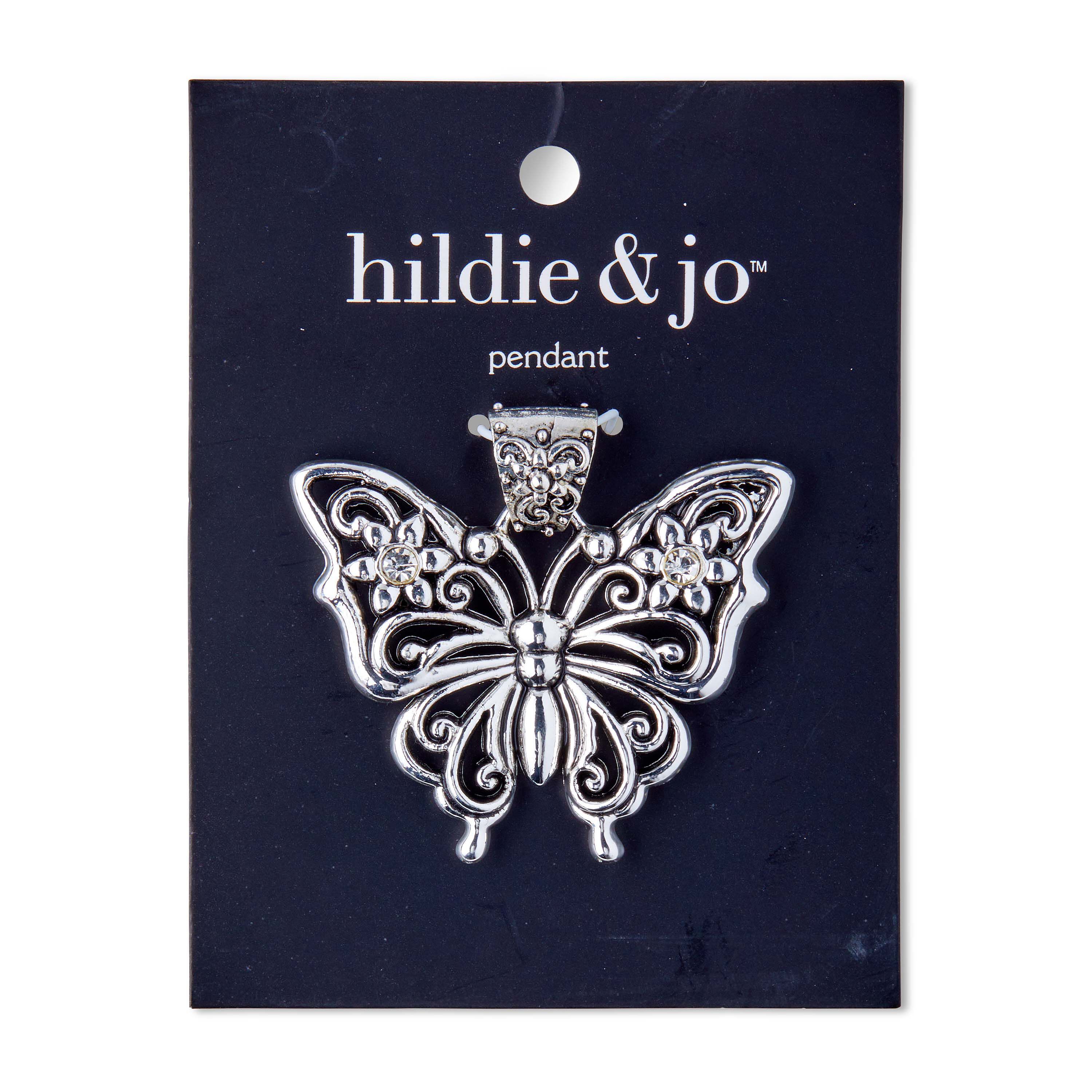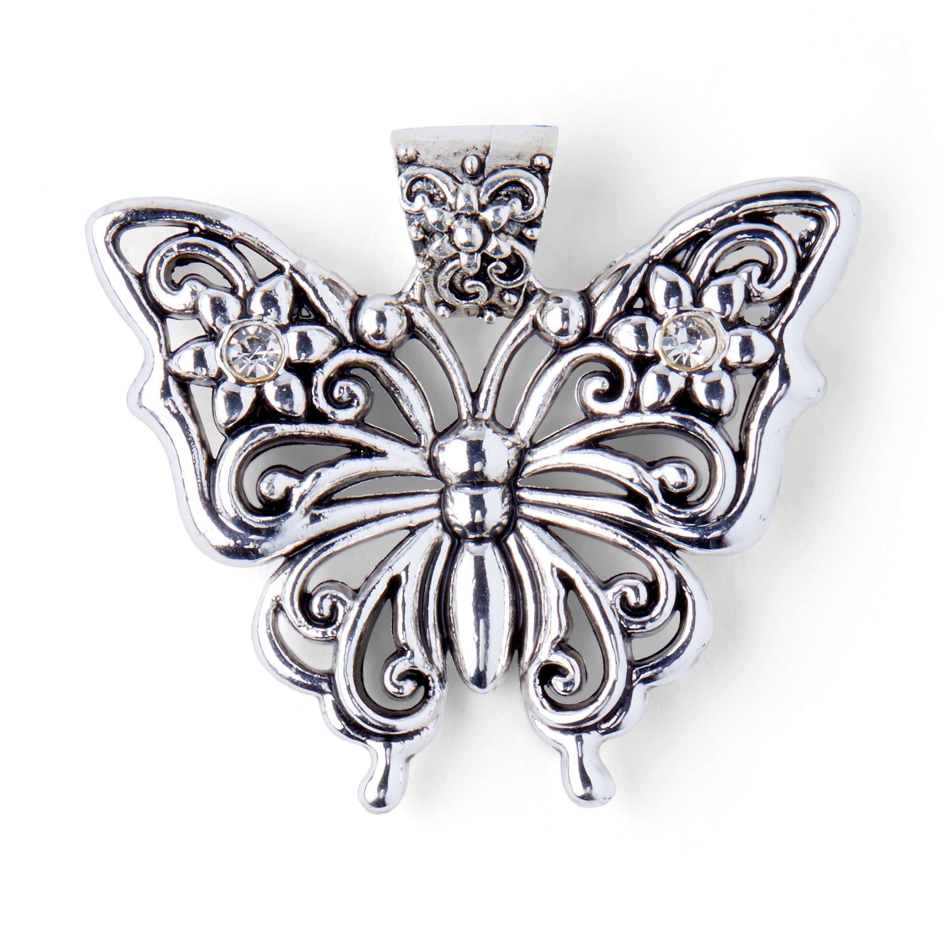 Use the hildie & jo Butterfly Pendant-Silver in your next DIY project. In antique silver, this pendant features a bail at the top for easy attachment. The bail has a flower and scroll design on it. The butterfly pendant has a smooth body and antennae. The wings have cutouts and a dot and scroll pattern. The top of the wing, on each side has a silver flower, with round silver center and petals that come to a point. Add it to a silver necklace and you are ready to go.
