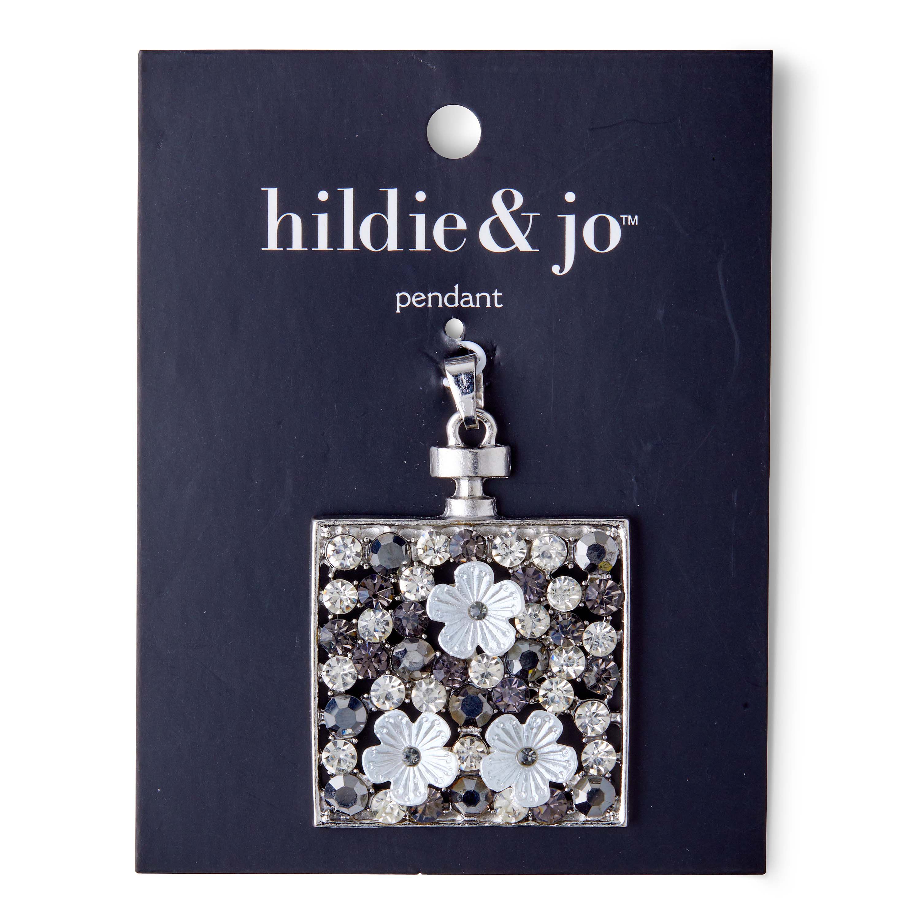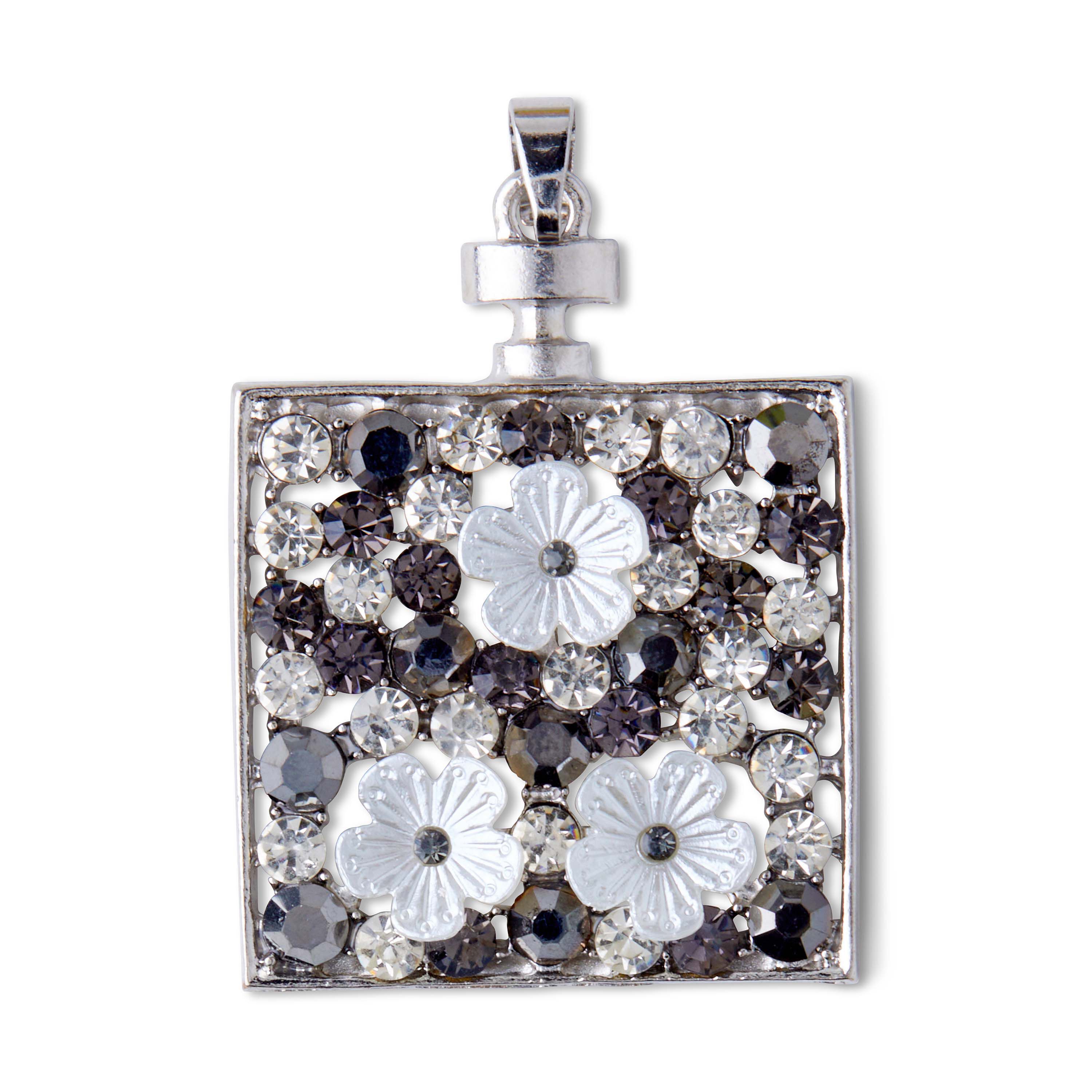 Infuse floral charm into your jewelry-making projects with the hildie & jo Square Silver Pendant with Flowers. The smooth silver pendant is artfully crafted in a square shape with three white flowers and clear round crystals within the mold. The gray and clear round faceted crystals are dispersed around in varying sizes. String it on long, sleek, silver-toned chain to complete your look.