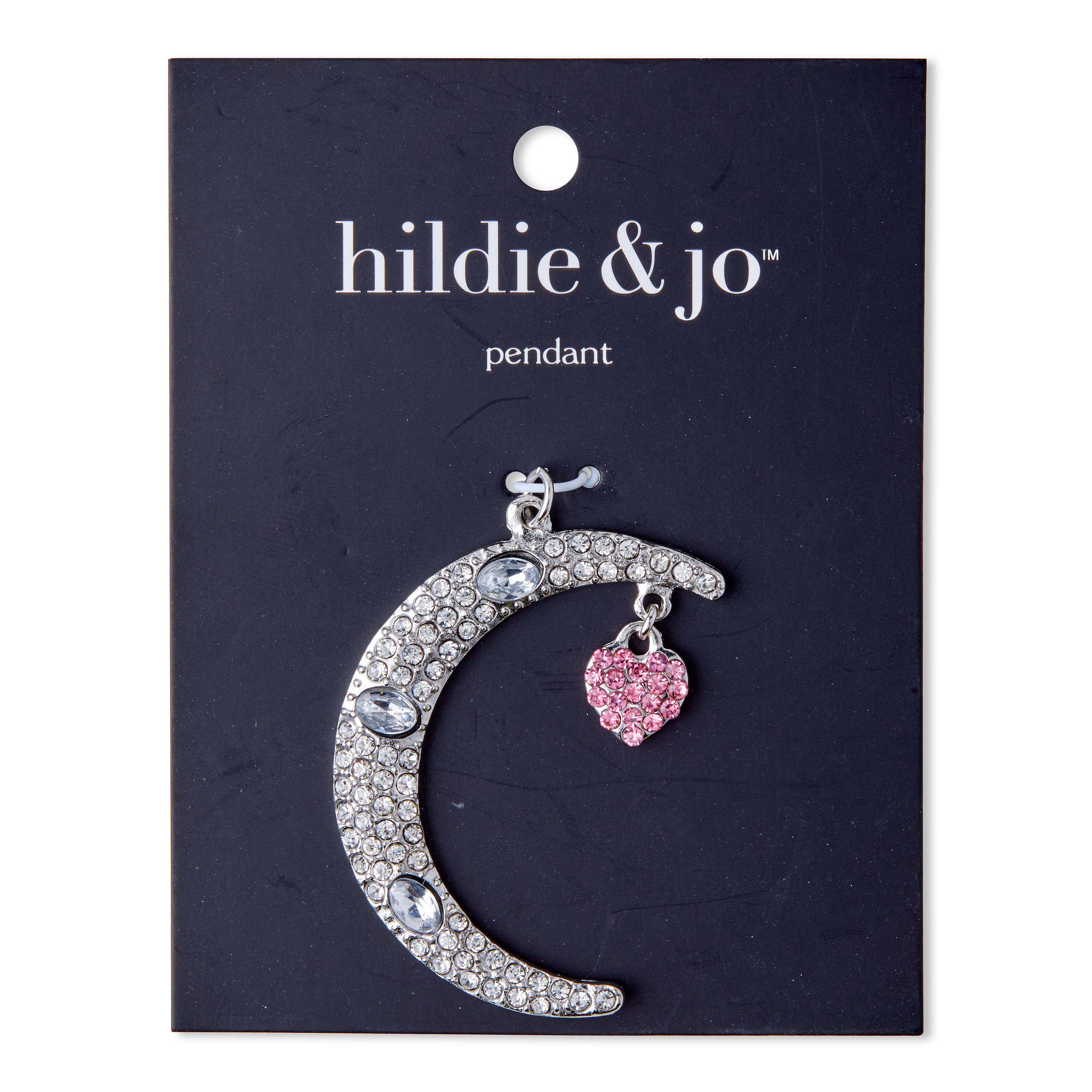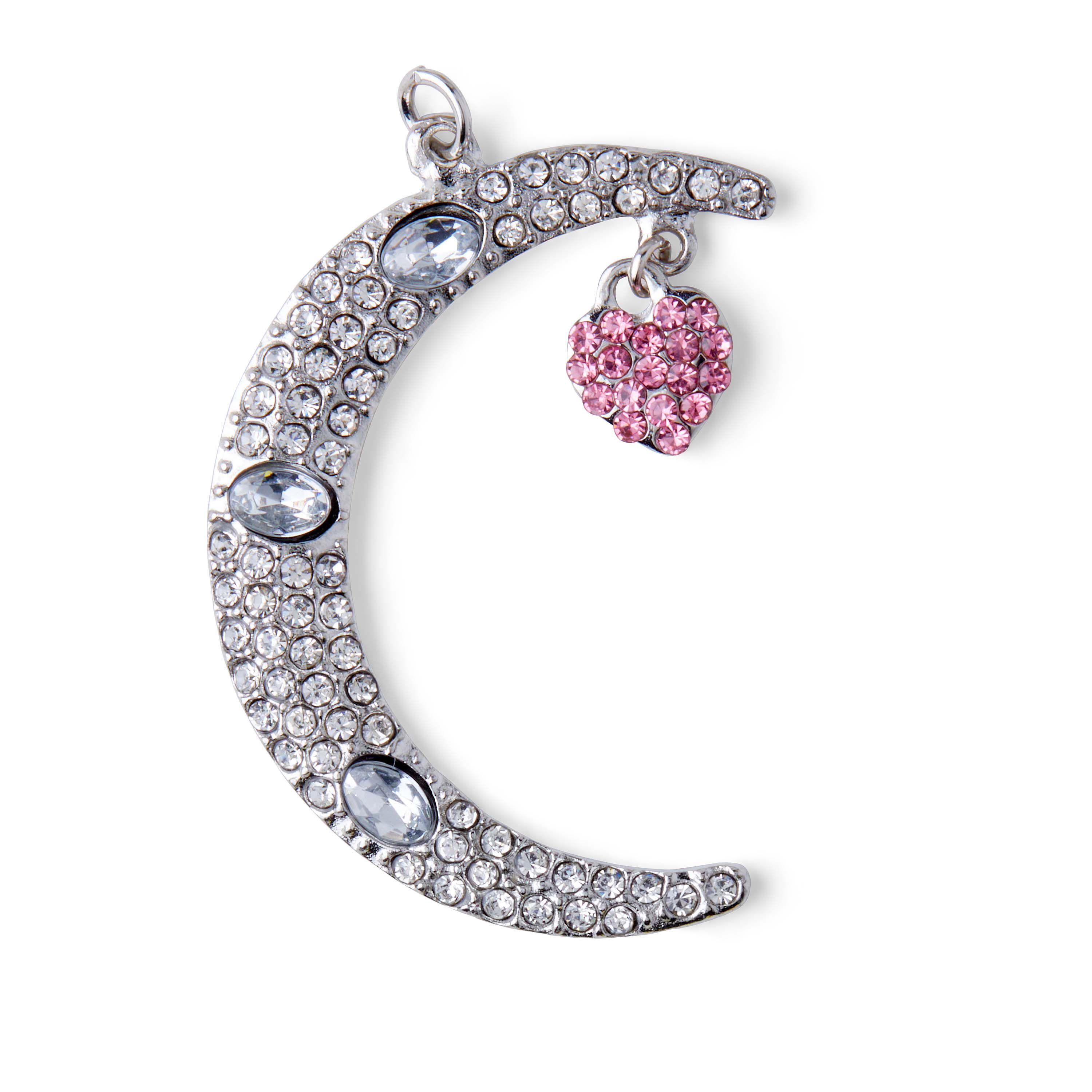 Add a sparkle to your ensemble with this elegant hildie & jo Boulevard Moon with Heart Silver Brooch. The moon is encrusted with clear round crystals, and the silver heart shape that dangles from the top of the moon is encrusted in pink crystals. This brooch features a bar pin back which you can transform into a beautiful necklace by attaching a matching chain or cord to go with your favorite outfits.