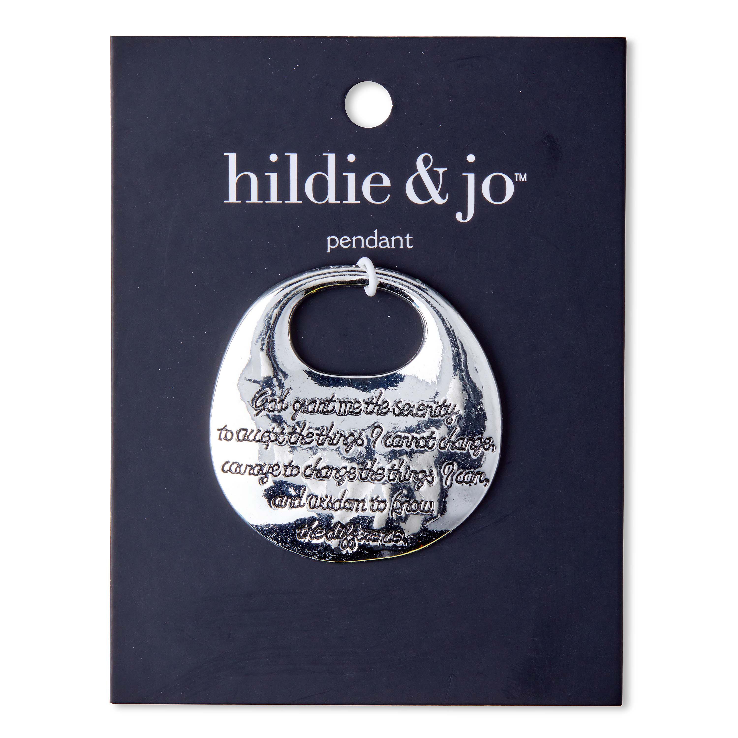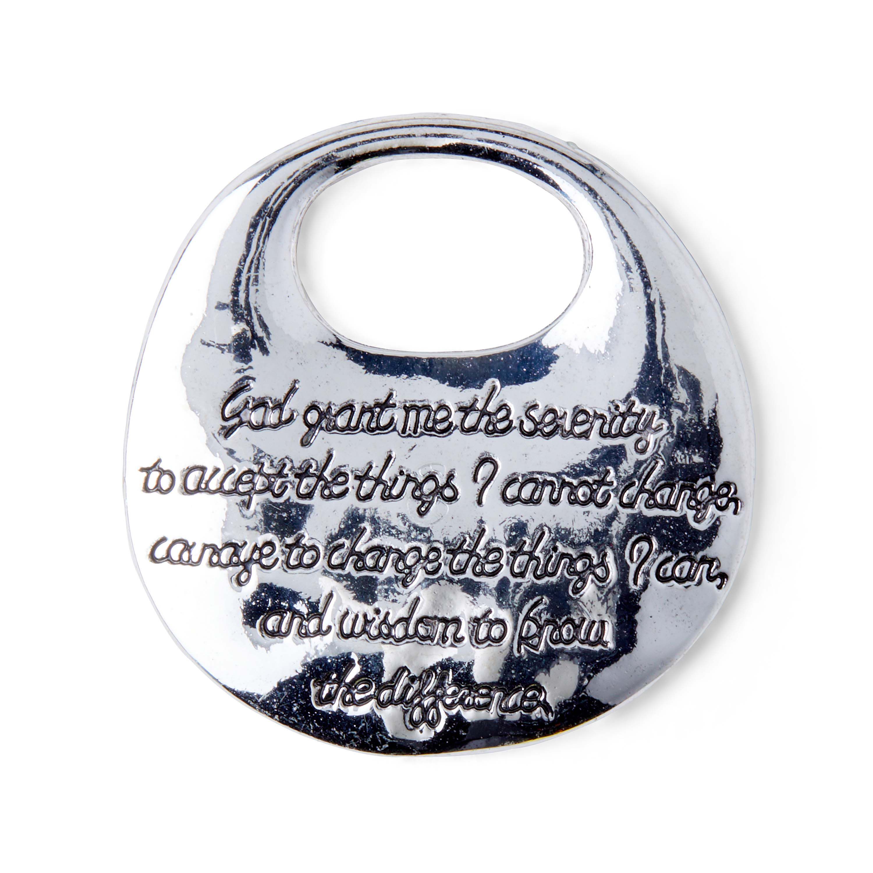 Large, rounded pendant with an antique silver finish presents the famous Serenity Prayer: God grant me the serenity to accept the things I cannot change; courage to change the things I can; and wisdom to know the difference." Size: 1-3/4" long