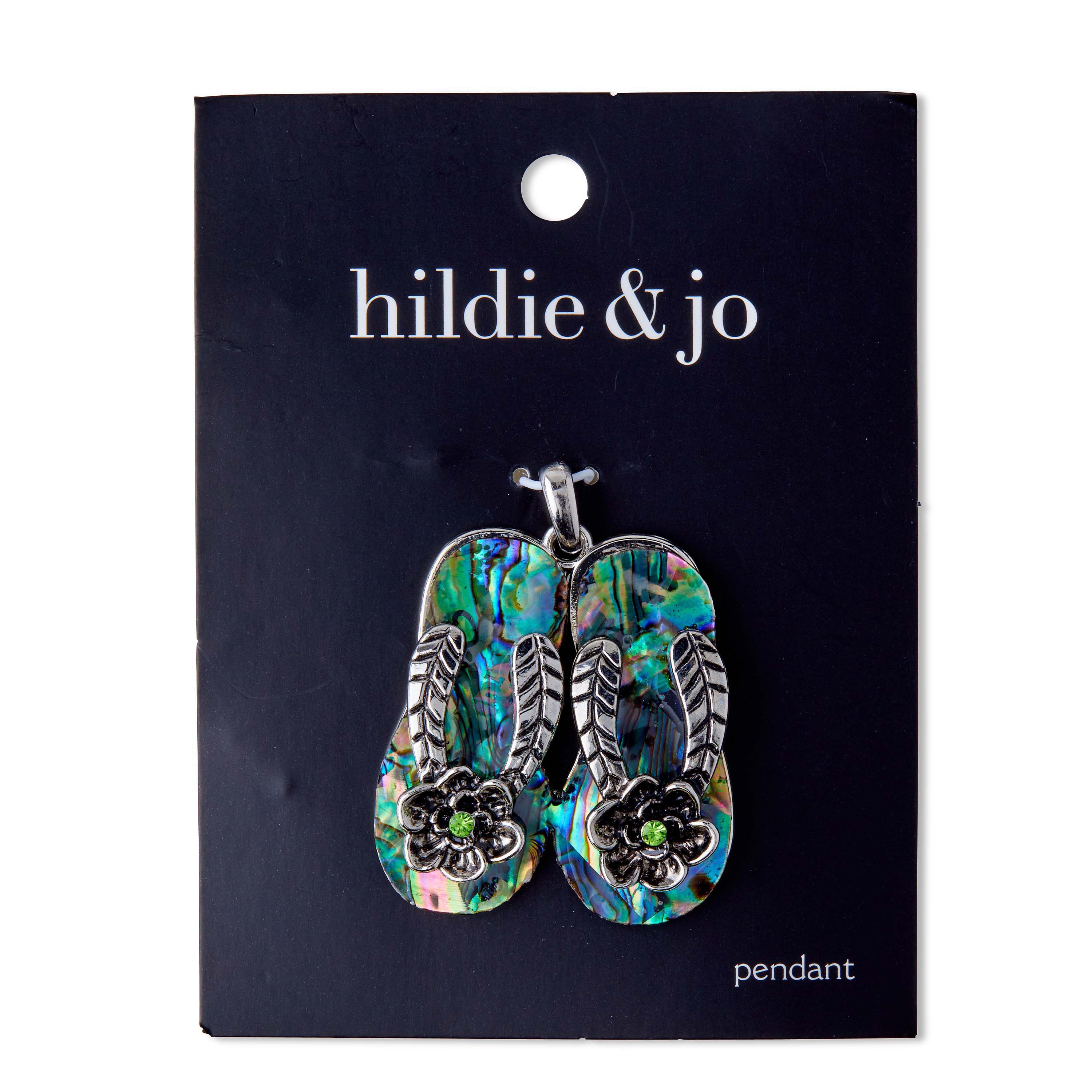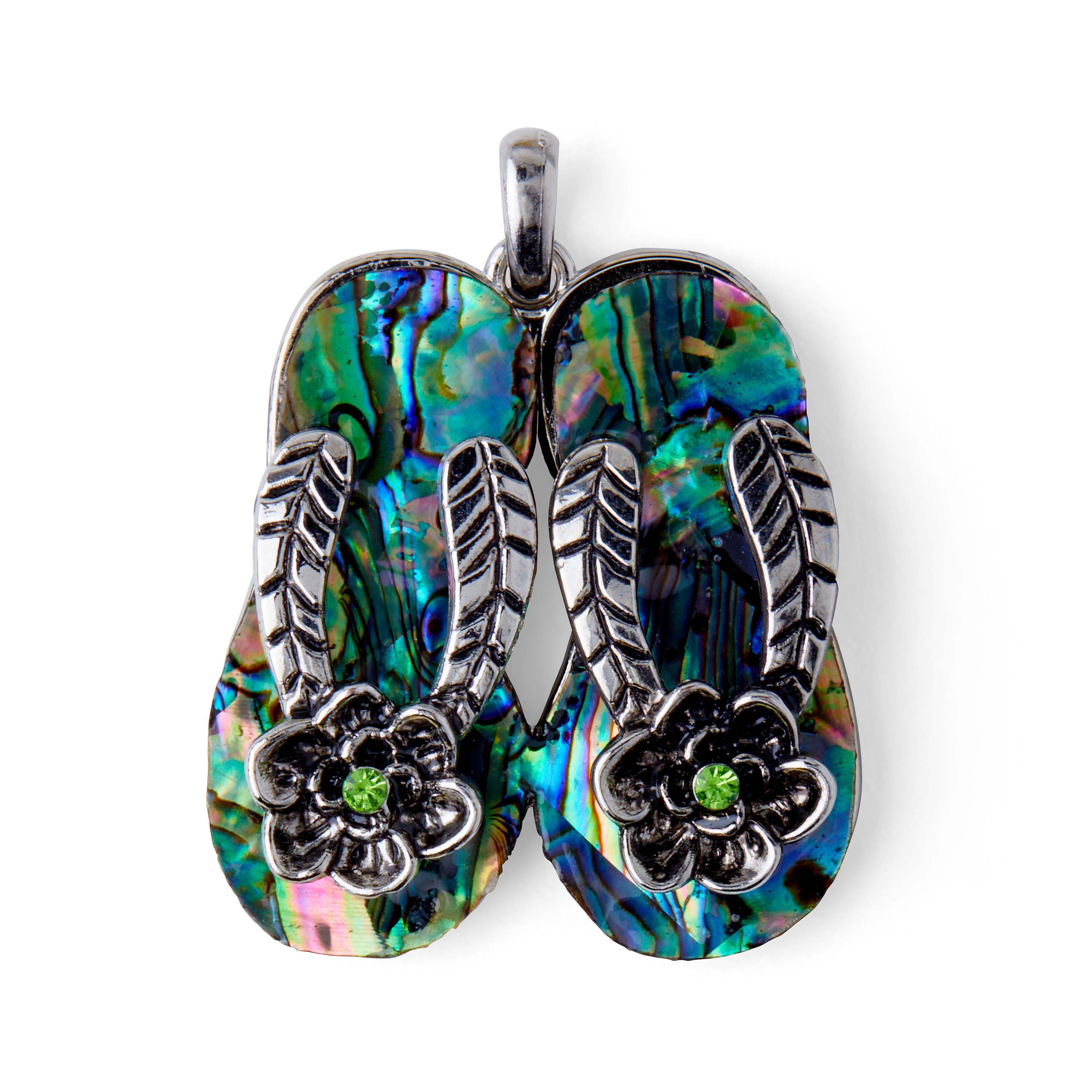 The hildie & jo Abalone Shell Flip Flop Pendant will make a quirky yet unique addition to your jewelry drawer. This pendant resembles a pair of ornate flip-flops that is inlaid with abalone stone and adorned with a flower-shaped accent. Add it to a chain to create a stylish neckpiece that you can wear to beach parties.