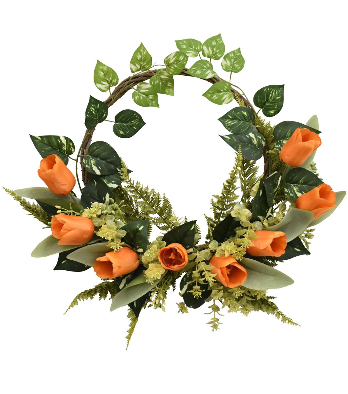 Give a charming makeover to your home decor with the Spring Orange Tulip & Fern Wreath by Bloom Room. Realistic tulips in orange along with fern fronds and leaves in green come together on this gorgeous wreath. Twirl string lights around it and add it to your entryway wall. You can also use it to decorate the mantel wall or front door.