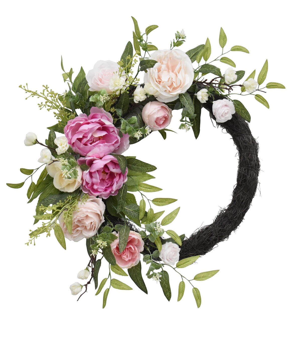 Display the Spring Pink Peony & Rose Wreath by Bloom Room on the front door and welcome your guests in style. Designed with a mix of faux peonies and roses in pink shades, this rattan wreath will add seasonal charm to your home decor. You can also add a bow to it or trim it with a ribbon for enhanced visual appeal.