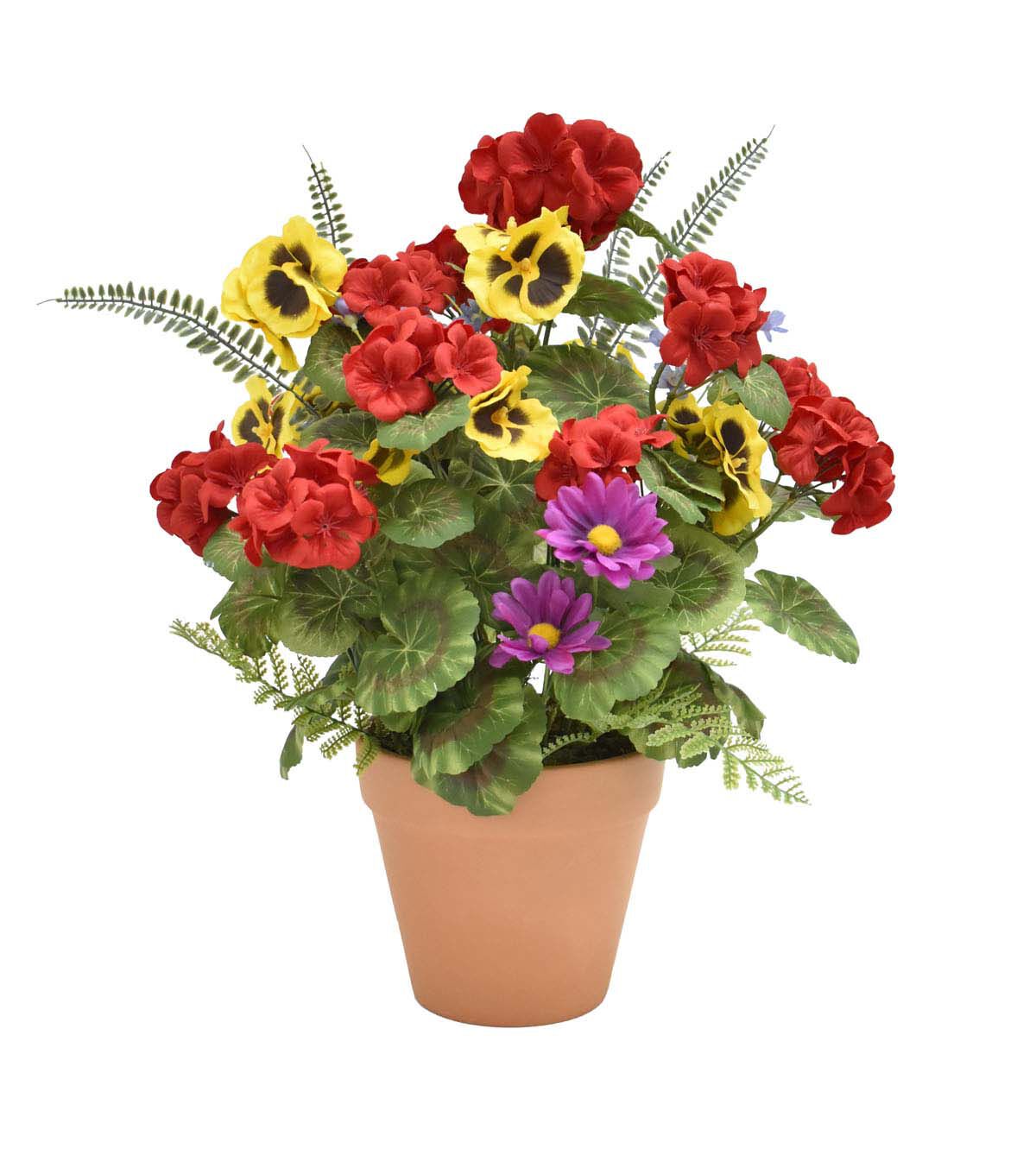 Transform your living space into a vibrant oasis with the Bloom Room 20" Summer Red Geraniums & Purple Pansies Arrangement. This stunning arrangement features lifelike red geraniums and purple pansies that will brighten up any room in your home. Whether you're looking to add a pop of color to your living room or want to create a welcoming atmosphere in your entryway, this arrangement is the perfect choice. The attention to detail is evident in every aspect of this arrangement, from the realistic textures of the flowers to the intricate design of the terracotta pot.